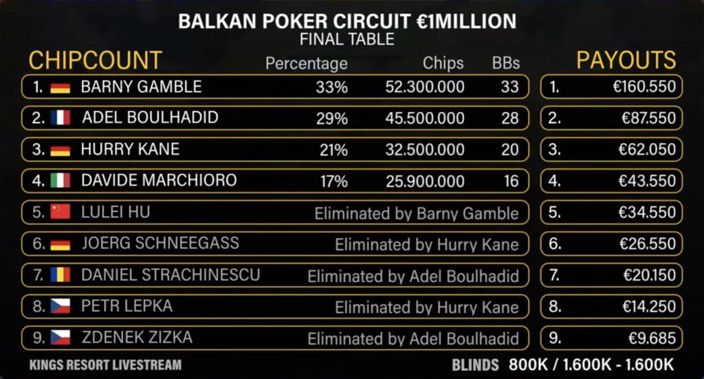 Ohne weiteren Payjump verabschiedete sich in der Folge der Italiener Davide Marchioro, der als Vierter (€68.000+€550) seine Pocket 10en in die Pocket Asse von Adel Boulhadid pushte. Damit stiegen die Hoffnungen auf einen deutschsprachigen Sieg an den Rails im Pokerroom King’s und im deutschsprachigen Livestream wurden fest die Daumen gedrückt. Zu einem Heads-Up zwischen den Landsmännern „Hurry Kane“ und „Barny Gamble“ sollte es jedoch nicht kommen, da „Hurry Kane“ auf Rang 3 (€74.200+€550) der Wind aus den Segeln genommen wurde.