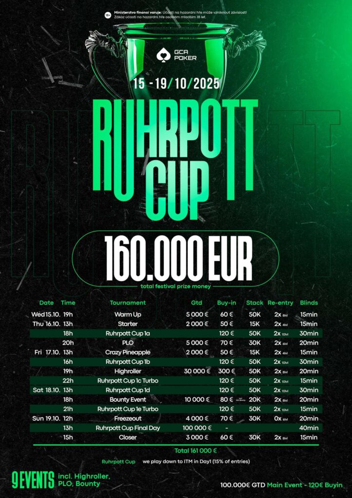9 Events mit €160.000 an Garantien, is klar – da kippste ausse Latschen! Wer auf Kohle geboren is, bringt auch Kohle mit ins Grand Casino As (GCA). Dort gibbet am Wochenende beim Ruhrpott Poker Cup für’n Appel und ’n Ei riesige Preispools zu gewinnen, allein garantierte €100.000 im Main Event, für gerade mal €120 Buy-In. Also kommt ma in die Pötte und zwischen dem 15. und 19. Oktober ins GCA! Glück auf!
