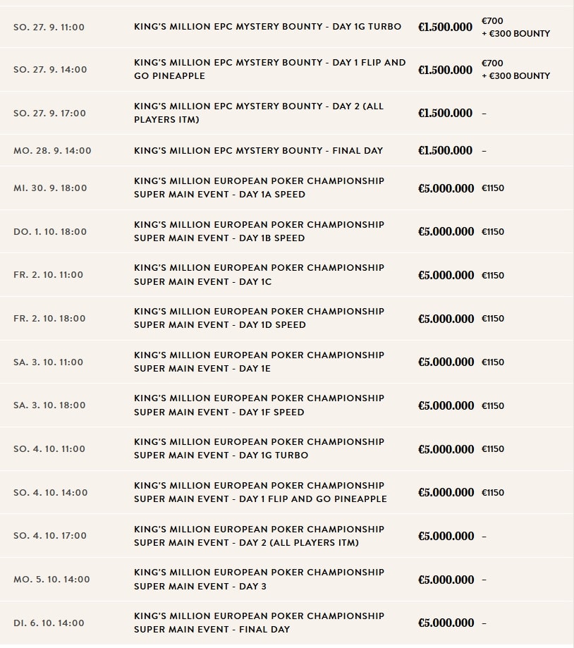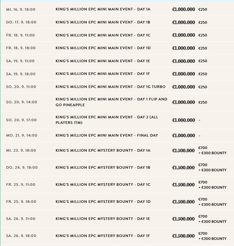Der große Run auf die beiden hauseigenen Pokerformate war anscheinend der Stein des Anstoßes, dass sich das King’s dazu entscheiden hat, mit der King’s Million European Poker Championship noch eins draufzusetzen. Zudem kann das Festival die Lücke im Turnierkalender vieler ambitionierter europäischer Spieler füllen, die mit dem Umzug der WSOPE vom King’s Rozvadov im Herbst ins King’s Prague im Frühling entstanden ist. Der Anspruch aus dem King’s Rekordevent eine Europameisterschaft zu machen unterstreicht dies. Voraussichtlich vom 16. September bis 7. Oktober wird die KM EPC im King’s Resort Rozvadov stattfinden und dabei nicht nur das Multi-Flight Main Event promoten, sondern ein volles Schedule mit vielen kleineren und größeren Events haben. Allein 4 davon besitzen einen siebenstelligen Millionenpreispool als Garantie. Das gesamte KM EPC Festival wird mehr als $10.000.000 im Gesamtpreispool haben!