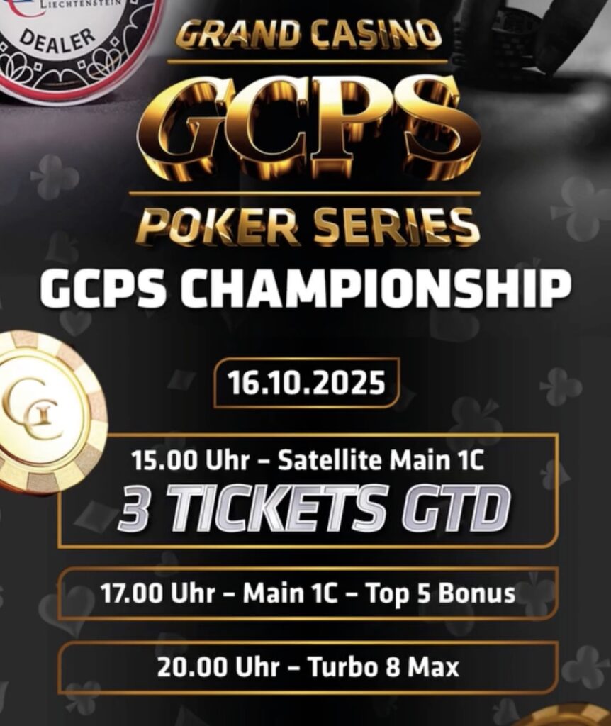 Am dritten Tag der GCPS Championship im Grand Casino Liechtenstein (GCLI) wurde mit Tag 1B ein weiterer Special Price Flight im Championship Main Event der Grand Casino Poker Series gespielt. Die 50 CHF Rabatt ließen sich 80 Entrys nicht entgehen, von denen 10 ein Tag-2-Ticket lösten, darunter auch 6 aus dem D-A-CH-L! Daneben wurde auch noch das Turbo Crazy Pineapple Side Event so wie ein Satellite im GC Pokerroom gespielt.