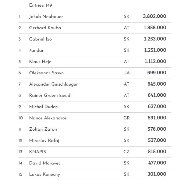 | 1C | 149 | 15 | Jakub Neubauer (SK): 3.802.000 |