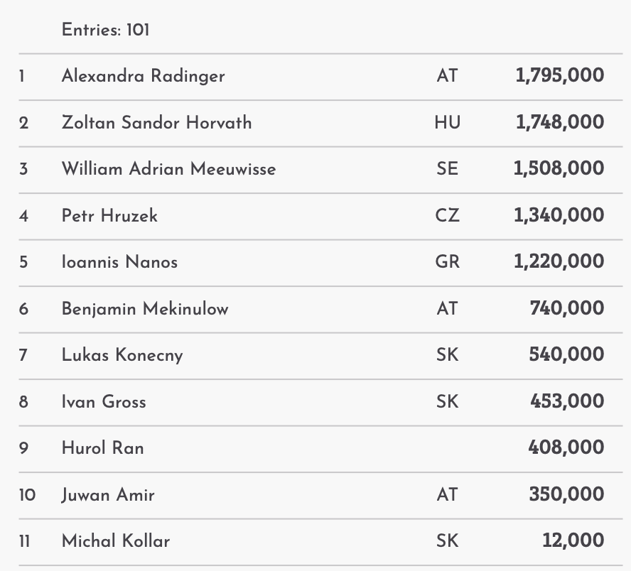 Somit haben wir nun insgesamt 478 Entries im Event, was gesammelte Startgelder von €47.800 bedeutet (vor Abzug der Gebühren)- Es sieht also gut aus, die €100.000 Garantie zu erreichen.