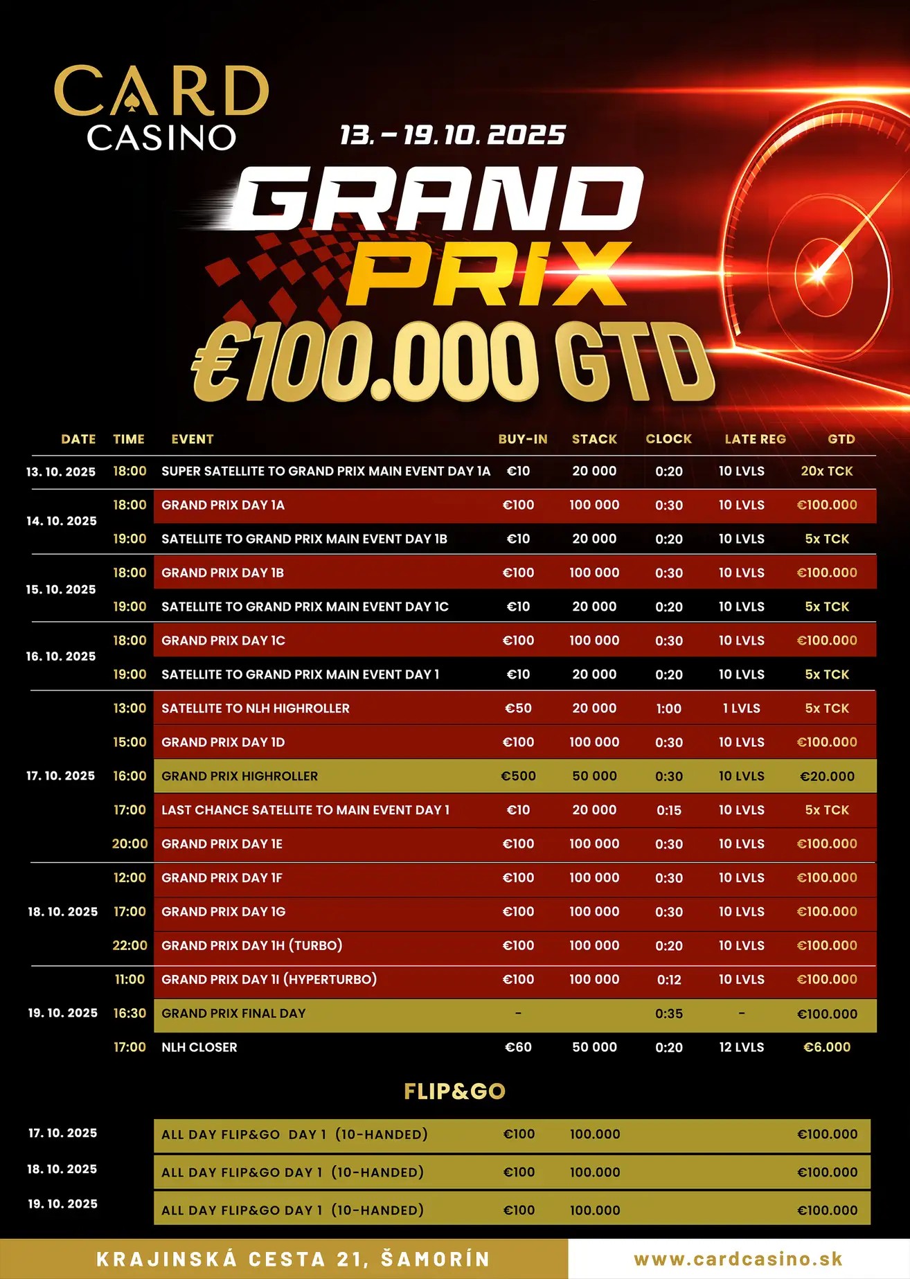 Im Card Casino Grand Prix Main Event wird für ein erschwingliches €100 Buy-in um mindestens €100.000 im garantierten Preispool gespielt. In neun Flights und den Flip & Gos am Wochenende gibt es die Chance, sich für das Finale am Sonntag um 16:30 Uhr zu qualifizieren. Gestartet wird mit 50.000 Chips, die Blinds erhöhen sich alle 30 Minuten, im Turbo alle 20 im Hyperturbo alle 12 Minuten.