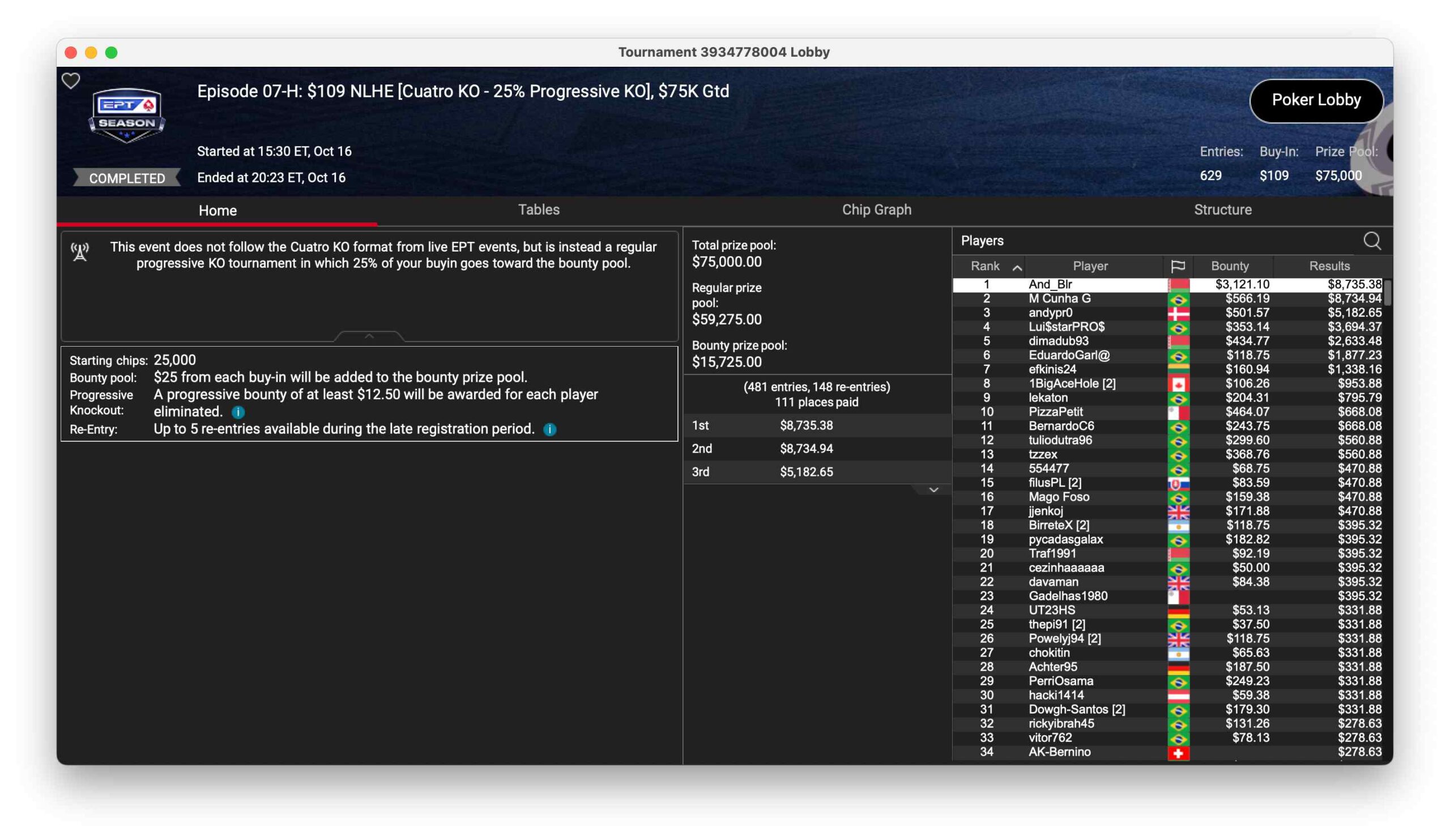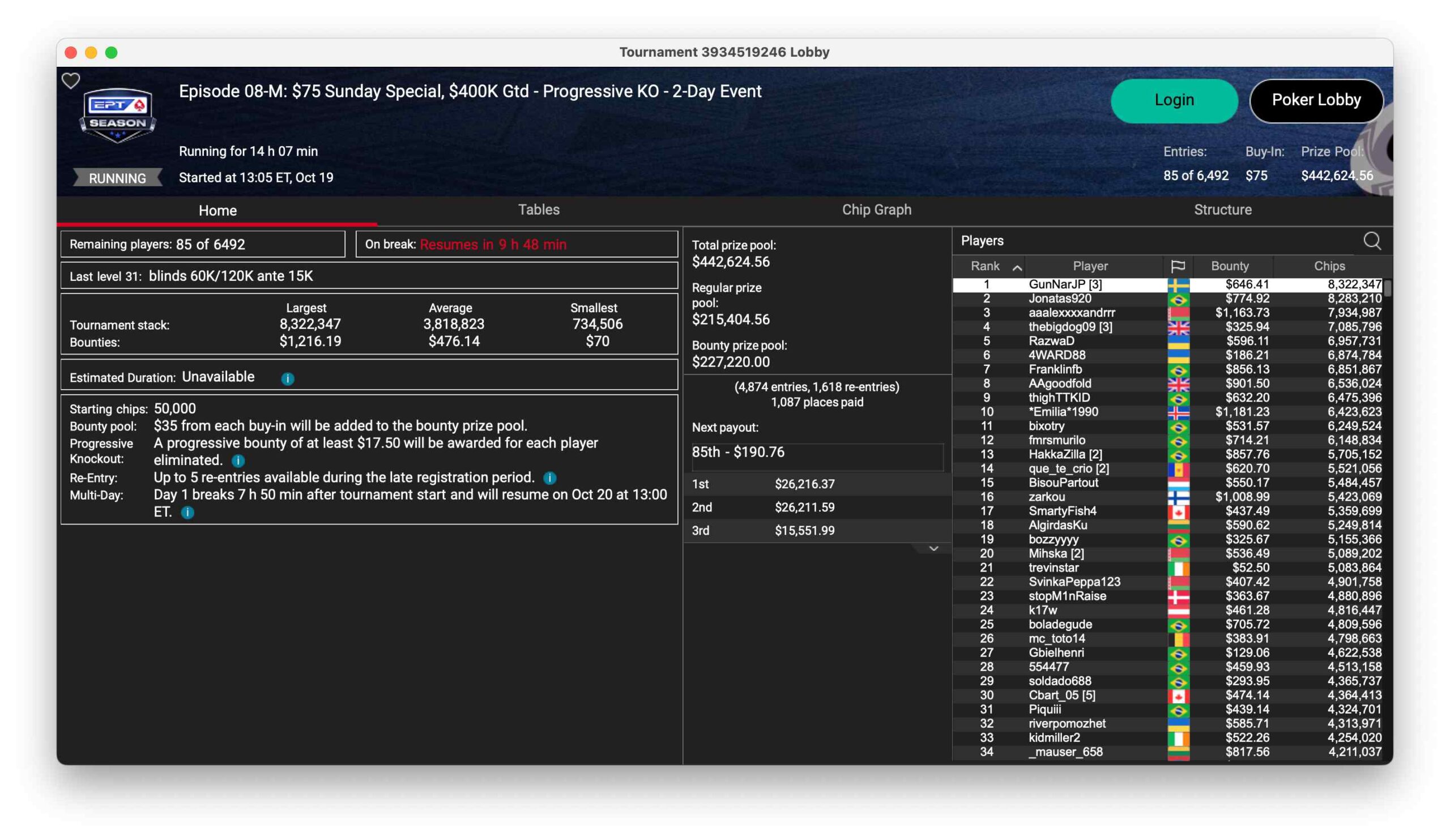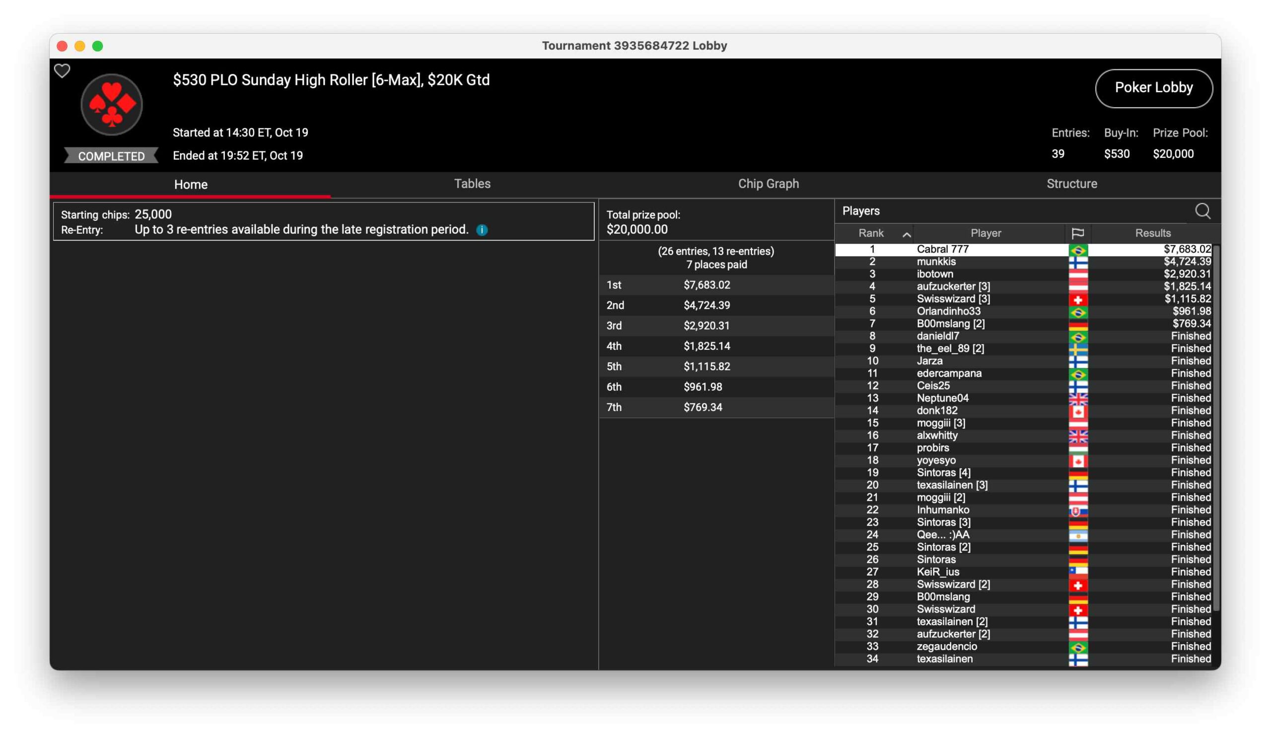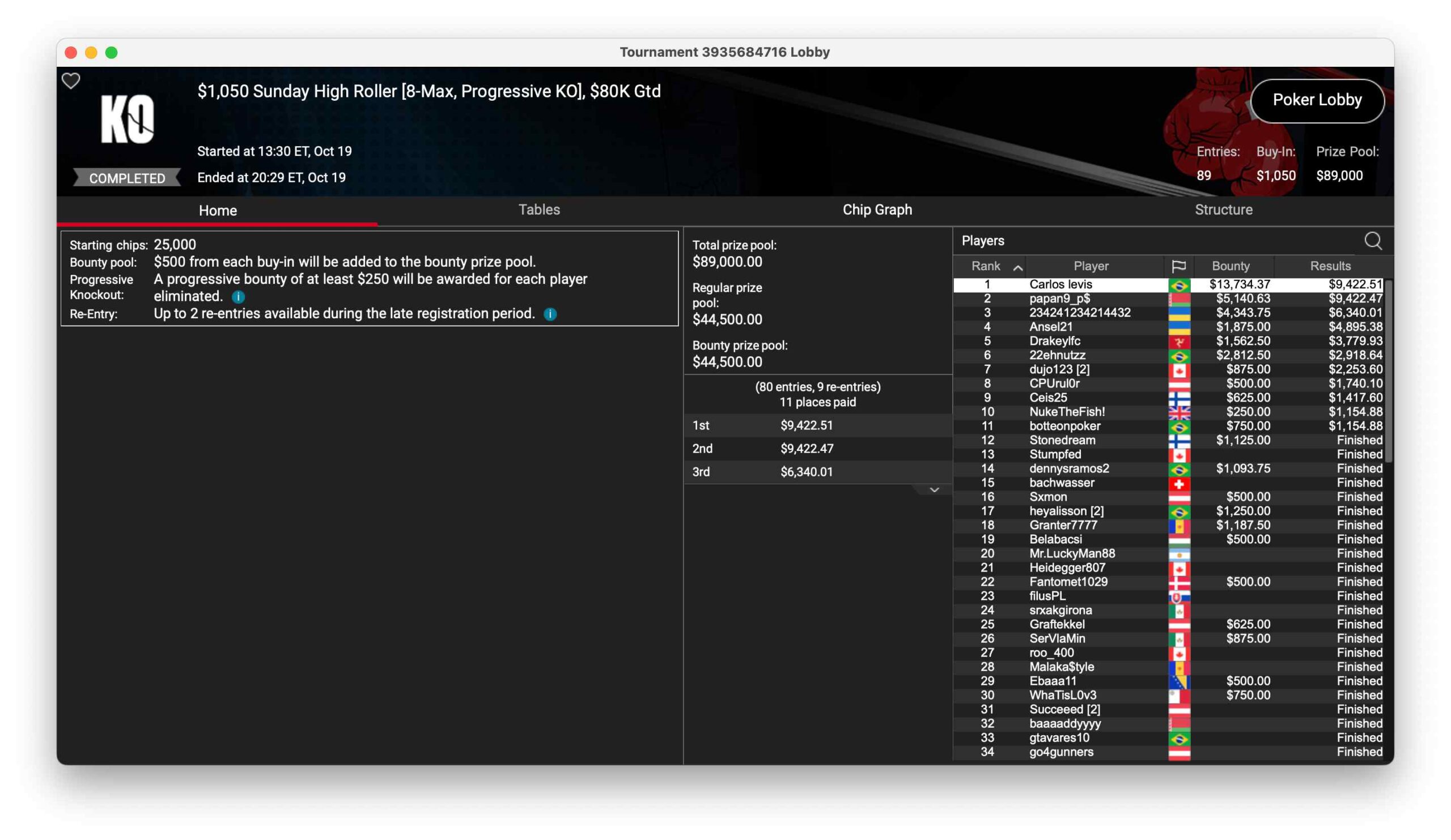 Das $1.050 Sunday High Roller hatte 89 Entries und einen $89.000 Preispool. Der Brasilianer „Carlos levis“ gewann für $13.734 + $9.422.