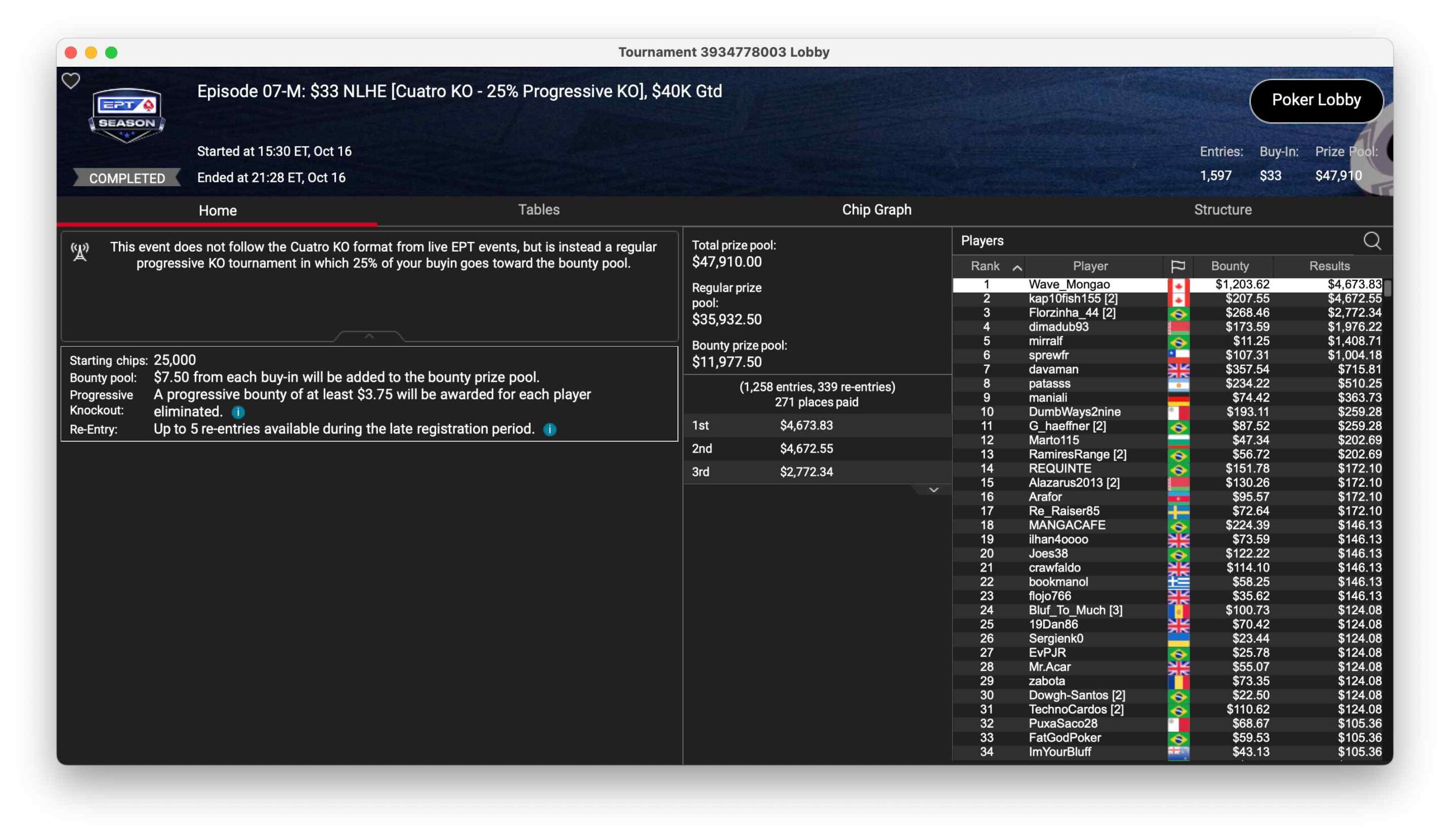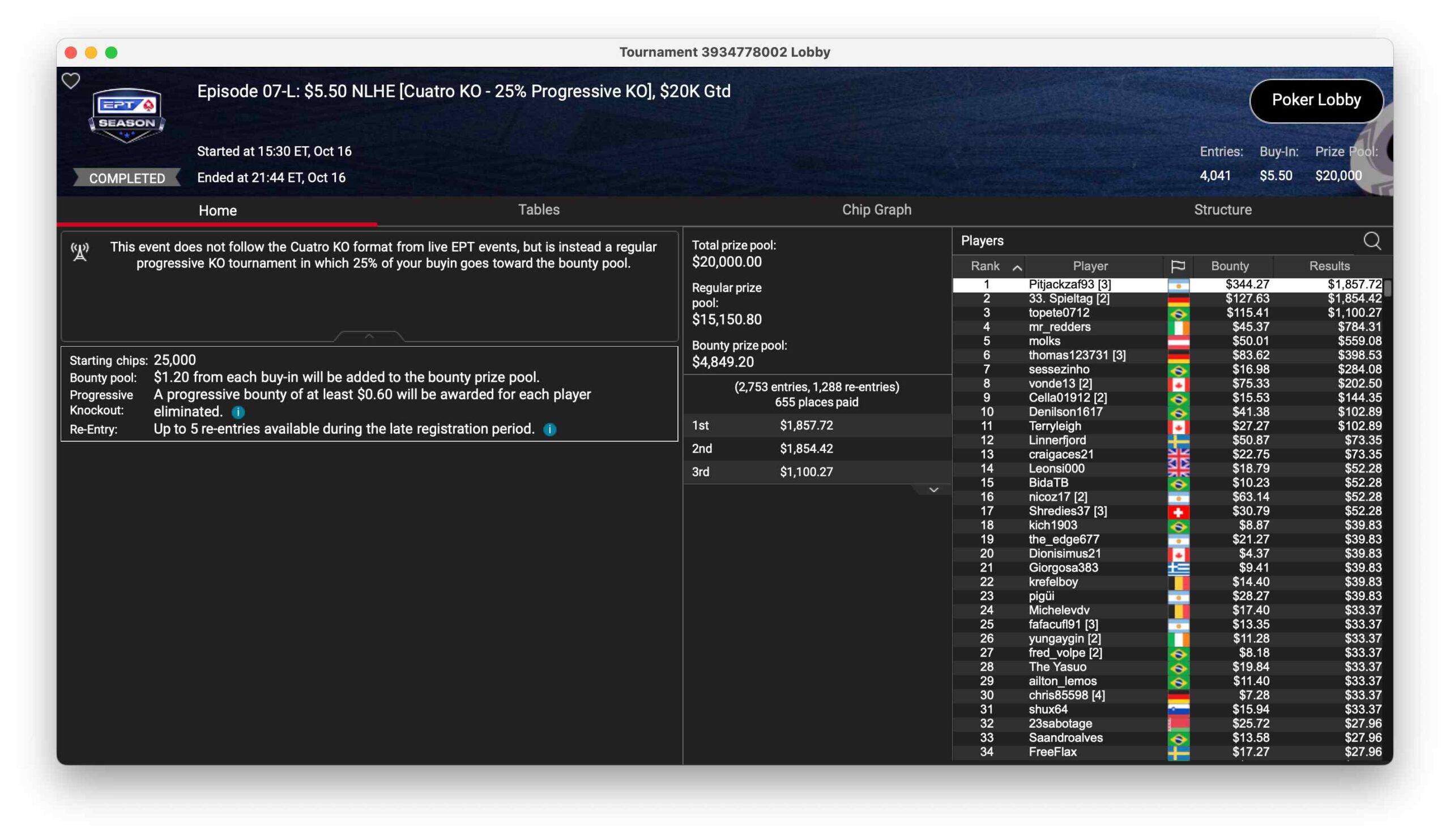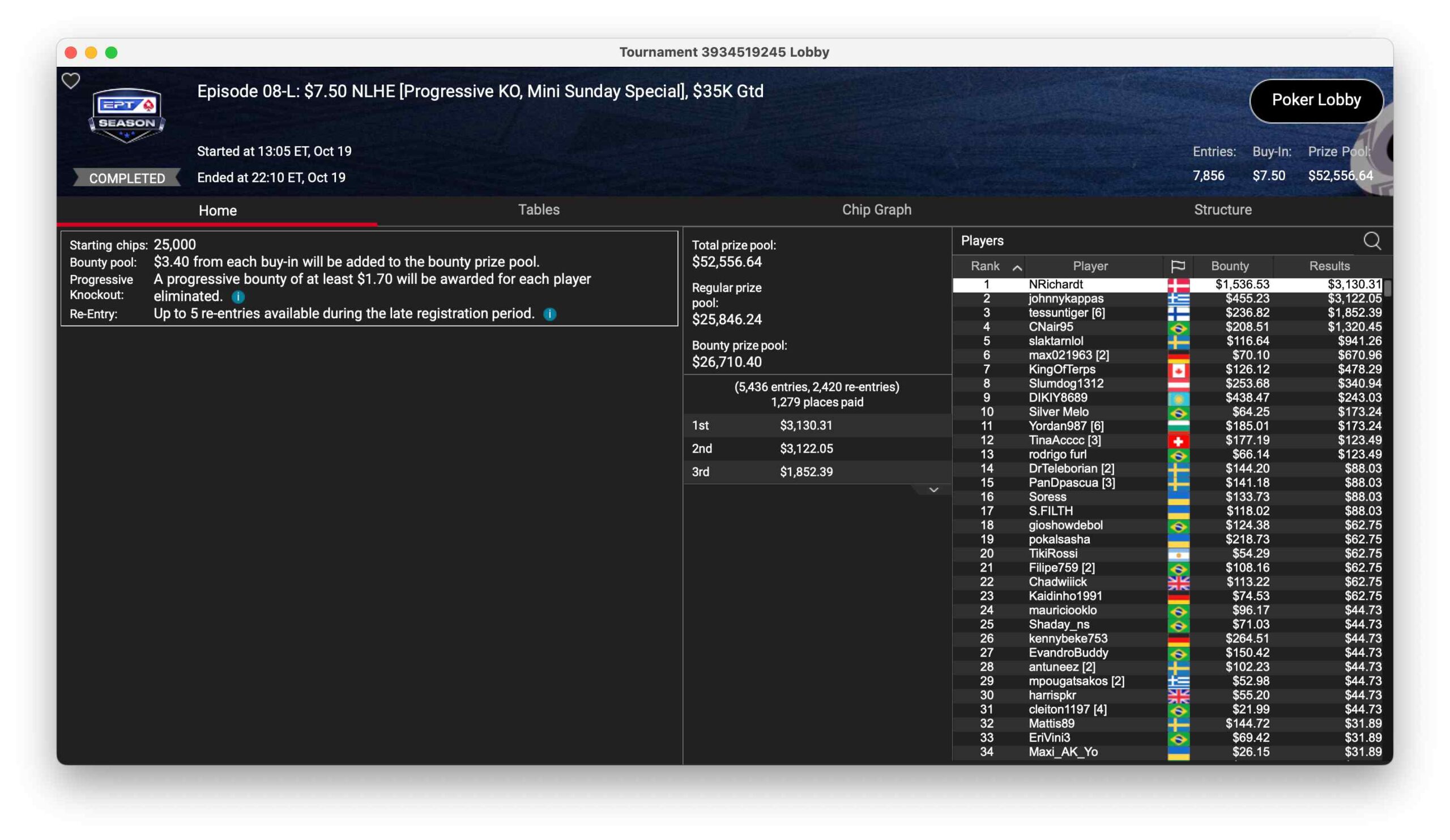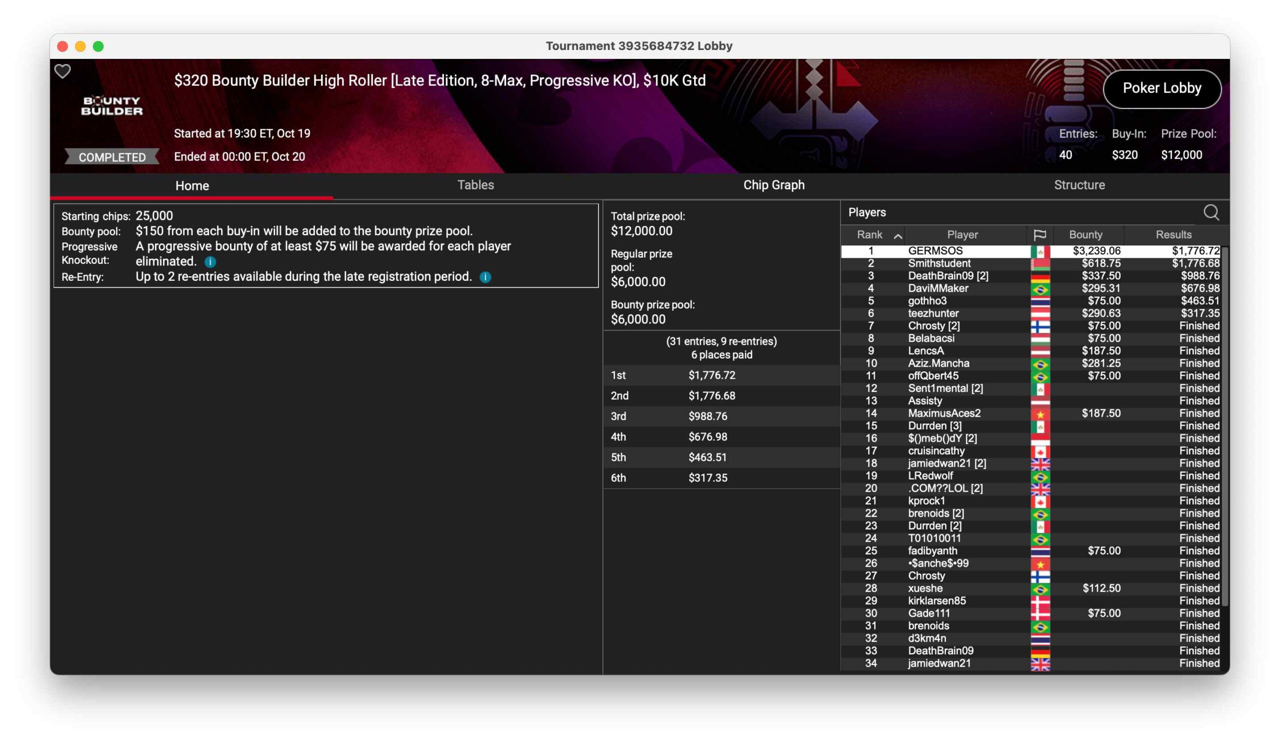 Ebenfalls unter österreichischer Flagge konnte der Grieche Alexandros „Pwndidi“ Theologis gewinnen. Er schnappte sich die Spätausgabe des Bounty Builder HR mit $320 Buy-In. Das Turnier hatte 48 Entries und $50.000 Preispool aus der Garantie. Er einigte sich im Heads-Up auf einen Deal mit dem Brasilianer Brunno „botteonpoker“ Botteon, der als Runner-Up mit $13.763 aus dem Turnier ging. Der Sieg von Theologis brachte $17.254 ein.
