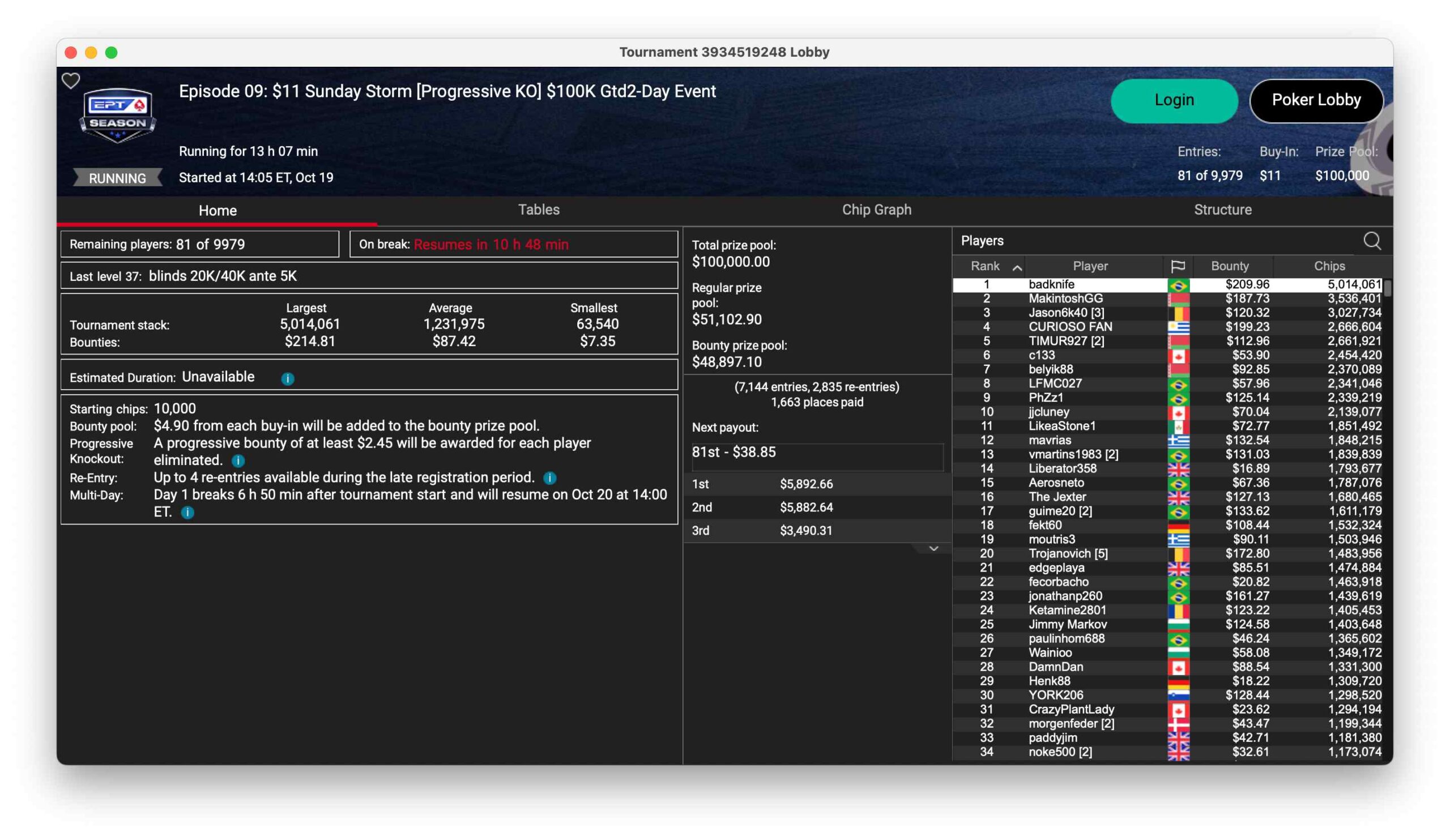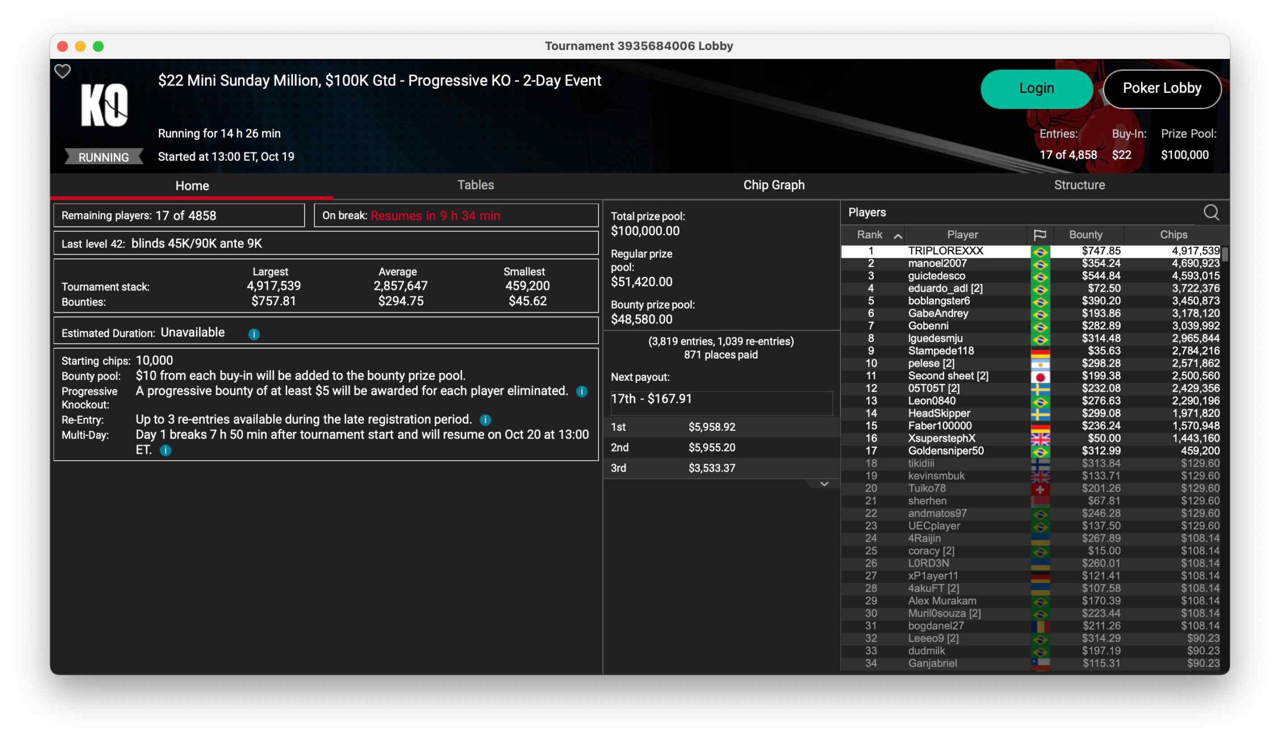 17 Spieler sind noch im Rennen, um den Sieg, der mit $5.958 + Bounties belohnt wird. Eine große Gruppe Brasilianer ist noch dabei. Aus den DACH-Ländern sitzt „Stampede118“ aus Deutschland in bester Position.