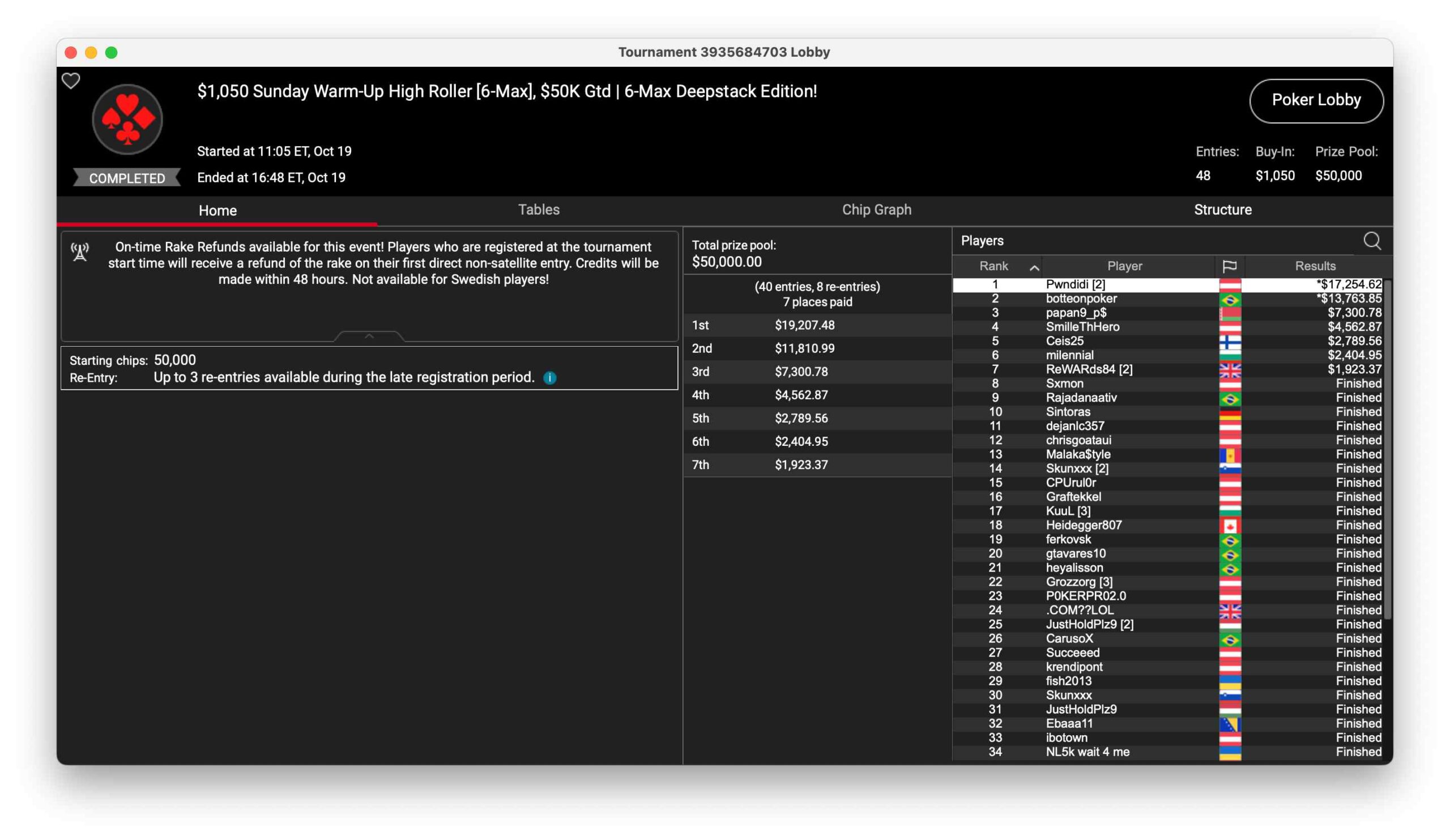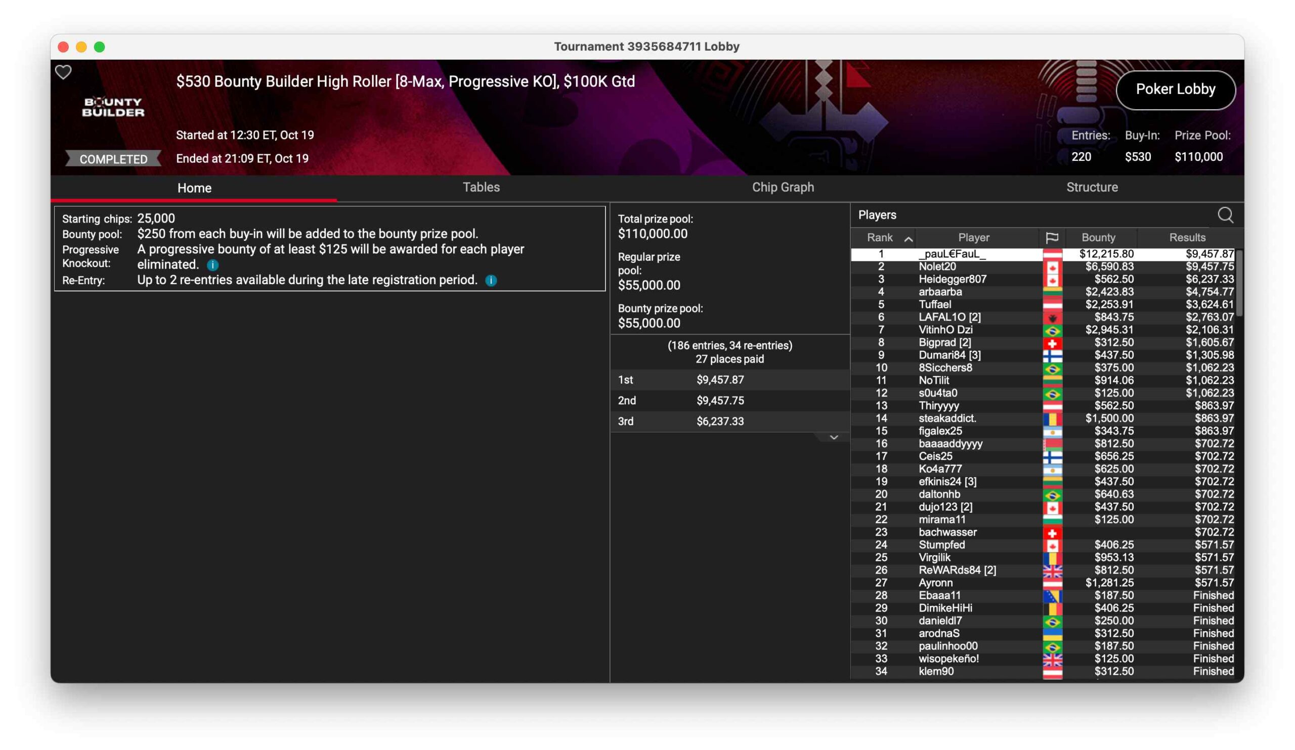 Das Turnier hatte 220 Entries und einen $110.000 großen Preispool. Paul „_paul€FauL_“ Höfer holte den Sieg für $12.215 + $9.457.
