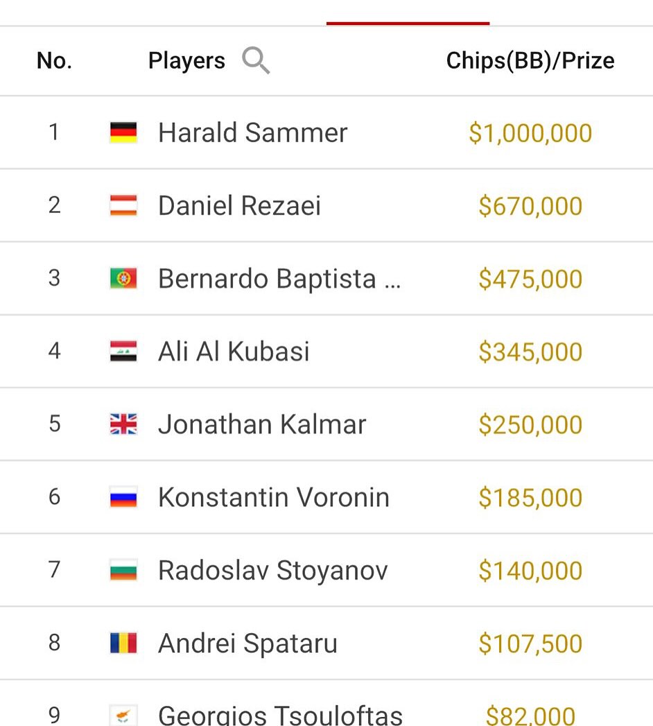 Daniel Rezaei, der als Chipleader in den Tag gestartet war, dominierte das Feld über weite Teile des Finales. Auf dem Weg in ein deutsch-österreichisches Heads-Up erwischte es Andrei Spataru (Platz 8, $107.500), Jonathan Kalmar (Platz 5, $250.000) und Bernardo Neves (Platz 3, $475.000).