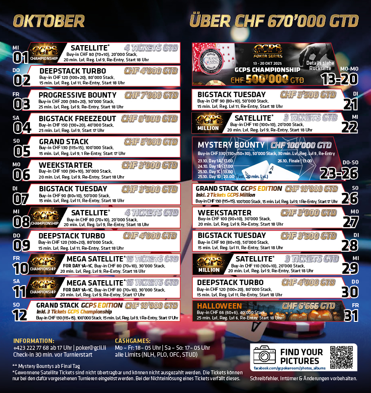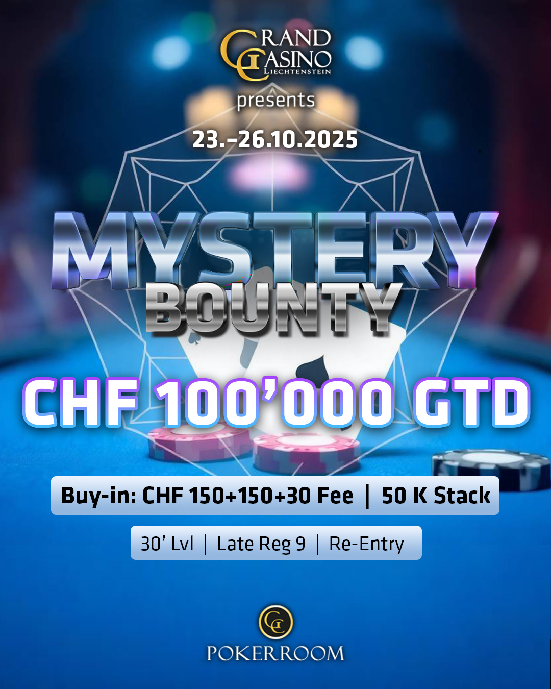 Das Mystery Bounty Festival im Grand Casino Liechtenstein (GCLi) ging am Freitag in den zweiten Starttag. Gegenüber der überschaubaren Beteiligung an Tag 1A, kamen an Tag 1B 68 Entrys für die 330 CHF Startgeld im GC Pokerroom Bendern zusammen, die sich für das Finale am Sonntag zu qualifizieren versuchten. 8 Überlebenden gelang dieses Kunststück.