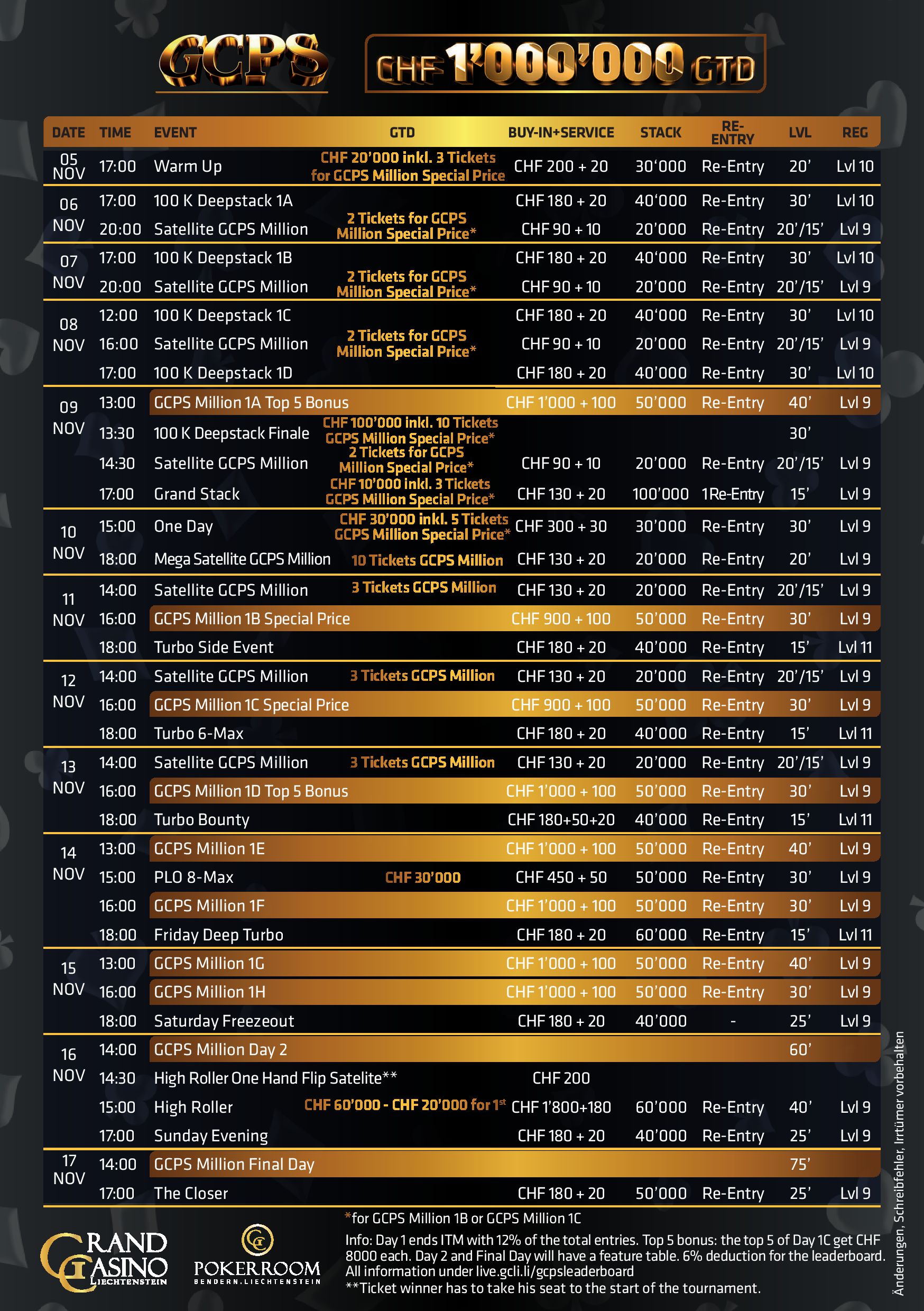 An vier Starttagen (1A bis 1D) wird um den Einzug in das Finale (SO, 13:00 Uhr) gespielt. Dazu erhalten die Teilnehmer*innen für 150+150+30 CHF Buy-In 50.000 Starting Chips und 30 Minuten Spielzeit pro Blindlevel (20 Minuten im Fast Day 1D). Jeweils 12% der Flightteilnehmer*innen landen ITM. Am Finaltag, der mit dem kleinsten der Endlevel der vier Starttage beginnt, werden dann auch die Mystery Bountys aktiv sein. Die Late Registration ist 9 Level lang an jedem Starttag geöffnet.