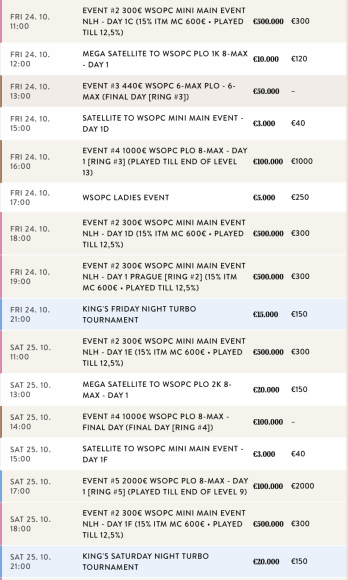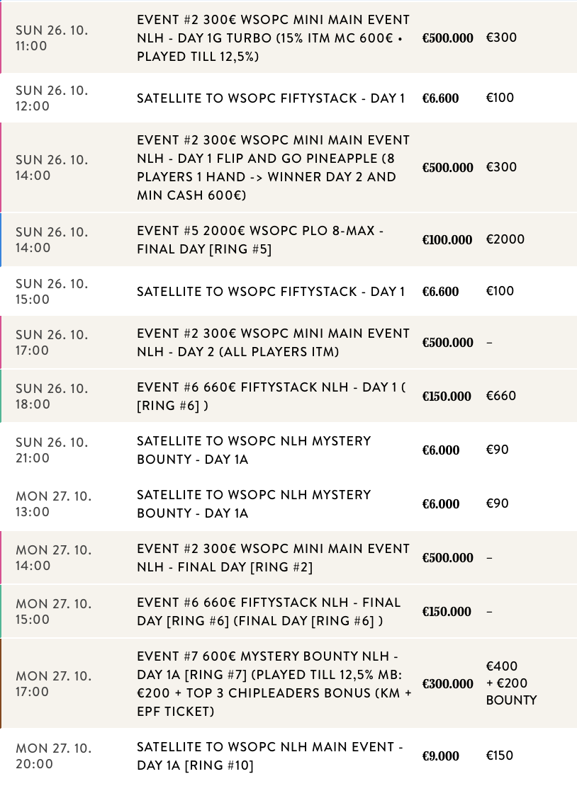 Drei weitere PLO-Turniere – das €440 WSOPC 6-max PLO (Event #3), das €1.000 WSOPC 8-Max (Event #4) und das €2.000 WSOPC 8-Max (Event #5) beschließen die erste Turnierwoche und läuten das große NLH-Programm ein.