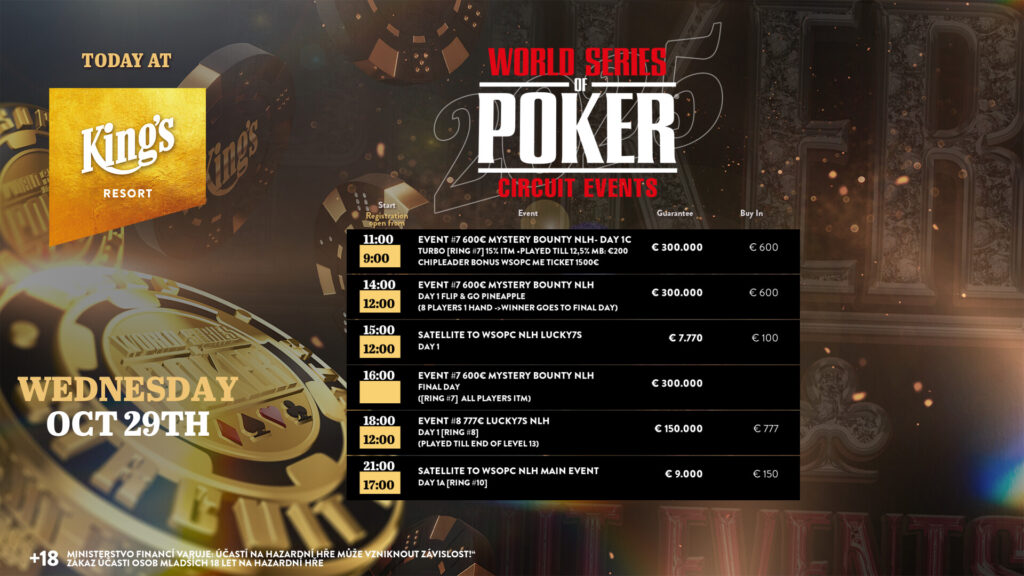 Das €600 Mystery Bounty Event besitzt 4 Qualifikationsmöglichkeiten (3 Starttage + 1 Flip and Go) an denen man für €400+€200 Startgeld unter die 15% ITM-Finisher und am besten noch unter die 12,5% Finalteilnehmer*innen vorstoßen kann. An dem zweiten und damit finalen Tag werden dann auch die Mystery Bountys im Spiel sein. €300.000 im Preispool sind für das Event #7 vom WSOP Circuit Rozvadov garantiert. Darin enthalten sind auch Packages für die King’s Million European Championship im Wert von jeweils €3.000 für die Top-10.