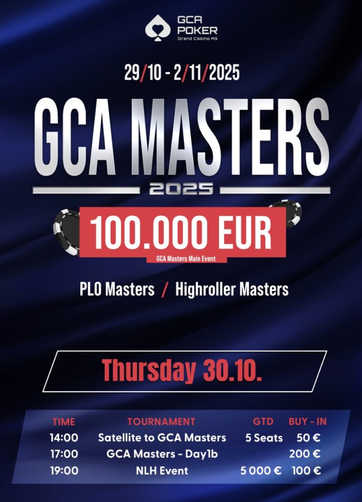 Das Main Event der GCA Masters weist bei €200 Buy-In eine Preispool-Garantie von €100.000 auf. Im Kampf um die großen Payouts stehen den Teilnehmer*innen 5 Flights (1a bis 1e) zur Verfügung. Darin wird mit 100.000 Starting Chips in 40-minütigen Leveln (20m Minuten in den Turbo Flight) um den Einzug in Tag 2 des 3-Day-Events gespielt. 13 Level stehen am Starttag auf dem Turnierplan, weitere zwölf an Tag 2 (SA, 17:00 Uhr), ehe es am Schlusstag ins Finale (SO, 14:00 Uhr geht).
