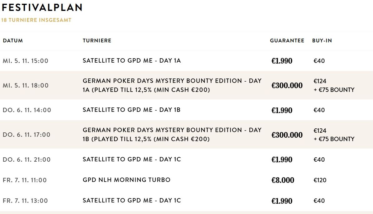 Am Samstag wird für jeweils €120 das GPD Pot-Limit Omaha und das GPD Saturday Night Turbo ausgetragen, parallel zum Finale am Sonntag steht das €350 GPD Highroller mit €30.000 Garantie auf dem Turnierkalender.