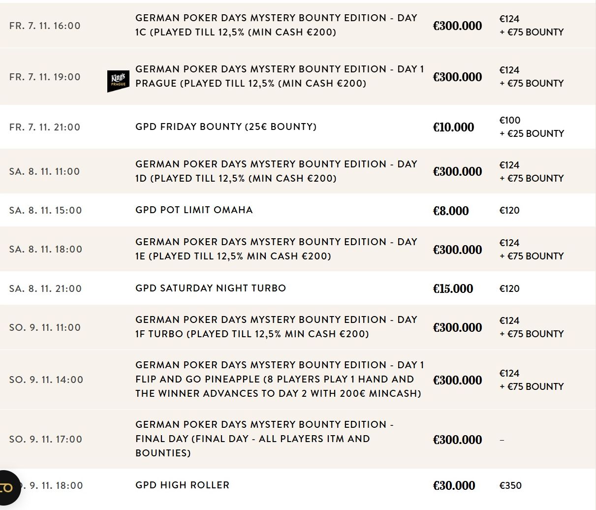 Daneben bietet das King’s im Verlauf der Turnierwoche einige Side Events an, wie das €120 GPD NLH Morning Turbo mit einer Garantie von €8.000 und das €125 GPD Friday Bounty am Freitag.