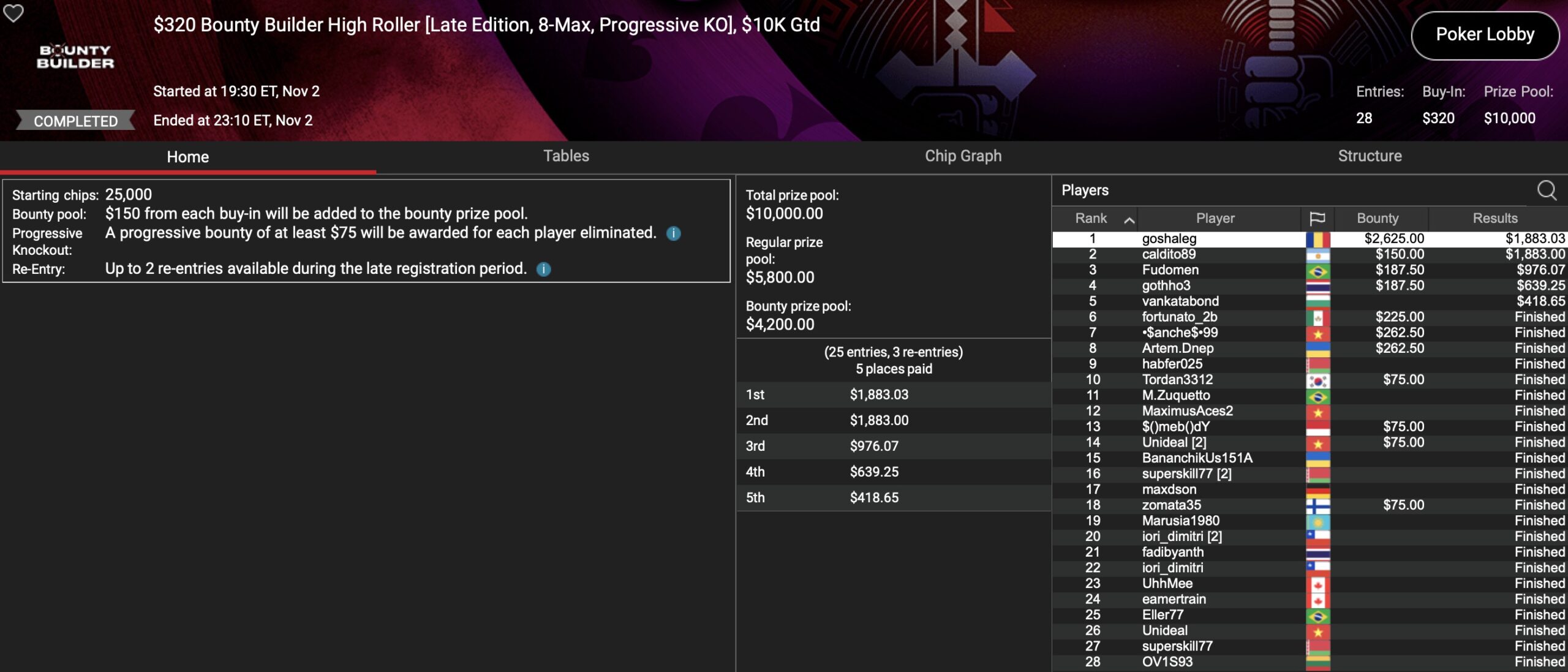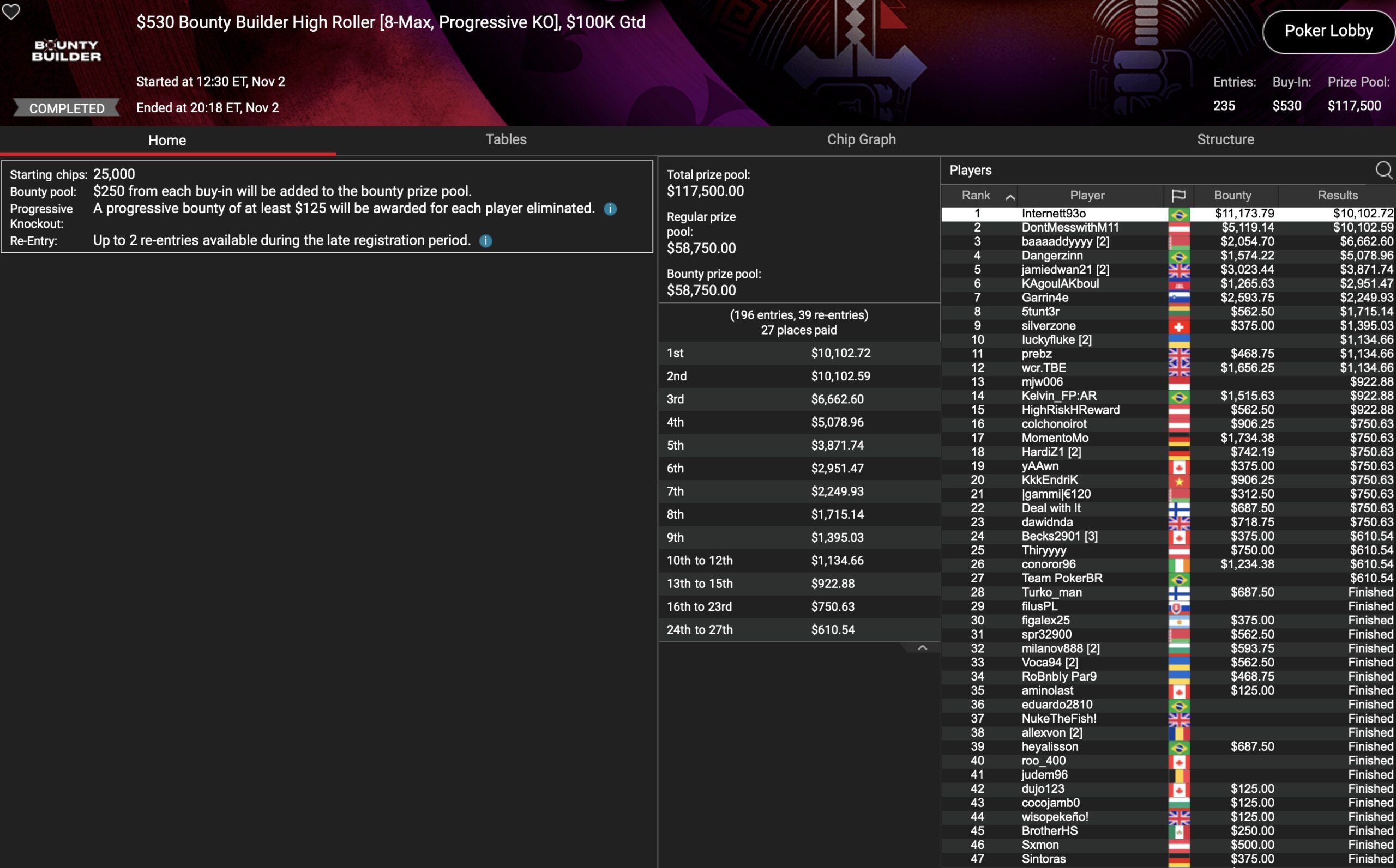 In den regulären High Roller Tagesturnieren auf PokerStars gab es in der $530 Bounty Builder High Roller Ausgabe zwei Spieler aus der D-A-CH-Community am Finaltisch zu feiern. Unter 235 (196+39) Entrys schaffte es „Don’tMesswitM11“ (AUT) im beliebtesten HR-MTT auf PokerStars auf Rang 2, was gleichbedeutend mit $10.102+$5.119 in dem PKO Turnier war. Mit „silverzone“ (SUI) war auf Rang 9 mit $1.395+$375 Payout ein weiterer D-A-CH-Spieler am FT vertreten. Der Sieg in der regulären Bounty Builder HR Ausgabe ging für $10.102+$11.173 an „Internett93o“ (BRA). In der $320 Bounty Builder High Roller Late Edition war „goshaleg“ (ROU) für $1.883+$2.625 unter 28 (25+3) Entrys erfolgreich.