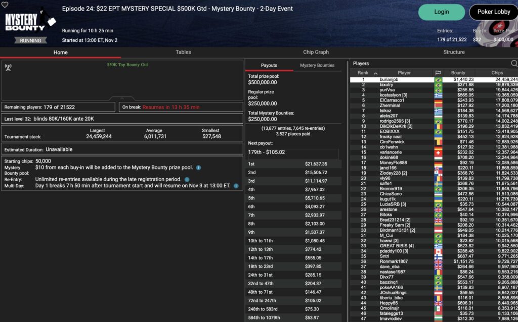 Mit dem $22 EPT MYSTERY SPECIAL mit $500k gtd, wurde ein 2-Day Mystery Bounty Event gestartet, das bei nur $22 Buy-In einen riesigen Preispool besitzt. Jeweils eine Viertelmillion landen im regulären Pricepool und im Mystery Bounty Pool. 21.522 (13.877+7.654) Entrys erreichten die $500k Garantie nicht ganz. Für Rang 1 gibt es $21.637 Payout, für den Top-Mystery-Bounty-Pull $50.000. Die zog „UMC_MJ“aus Estland bereits an Tag 1. Unter den verbleibenden 179 Spielern sind auch zahlreiche deutschsprachige. Am besten von ihnen liegt „ElCarrasco“ (GER) auf Rang 5 mit 17.808.079 Chips im Rennen.