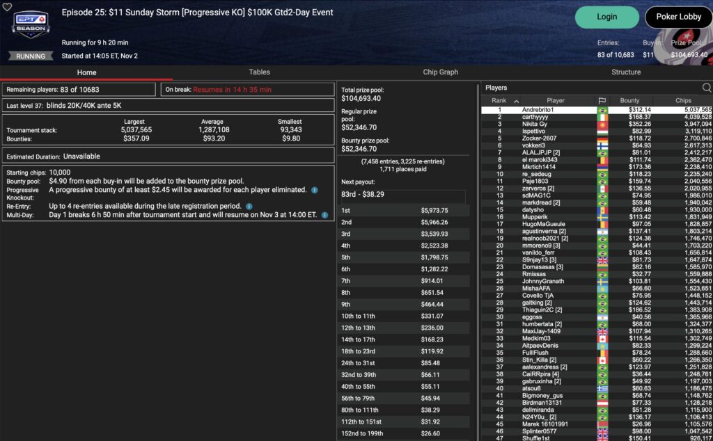 Der $11 Sunday Storm wurde am Sonntag zur Episode 25 der EPT Season. 10.683 (7.458+3.25) Entrys ließen sich die Chance auf den garantierten $10k Preispool nicht entgehen und übertrafen diesen mit $104.693 sogar. In dem Progressive Knockout MTT liegen somit jeweils zur Hälfte $52.346 im regulären und im Bounty Preispool. Unter den 83 verbliebenden Spielern sind auch noch 5 deutschsprachige mit von der Partie um die progressiven Kopfgelder und die $5.973 Siegprämie. Am aussichtsreichsten liegt „Zocker-2607“ (GER) auf Rang 5 des Zwischenklassements mit 2.700.846 Chips.