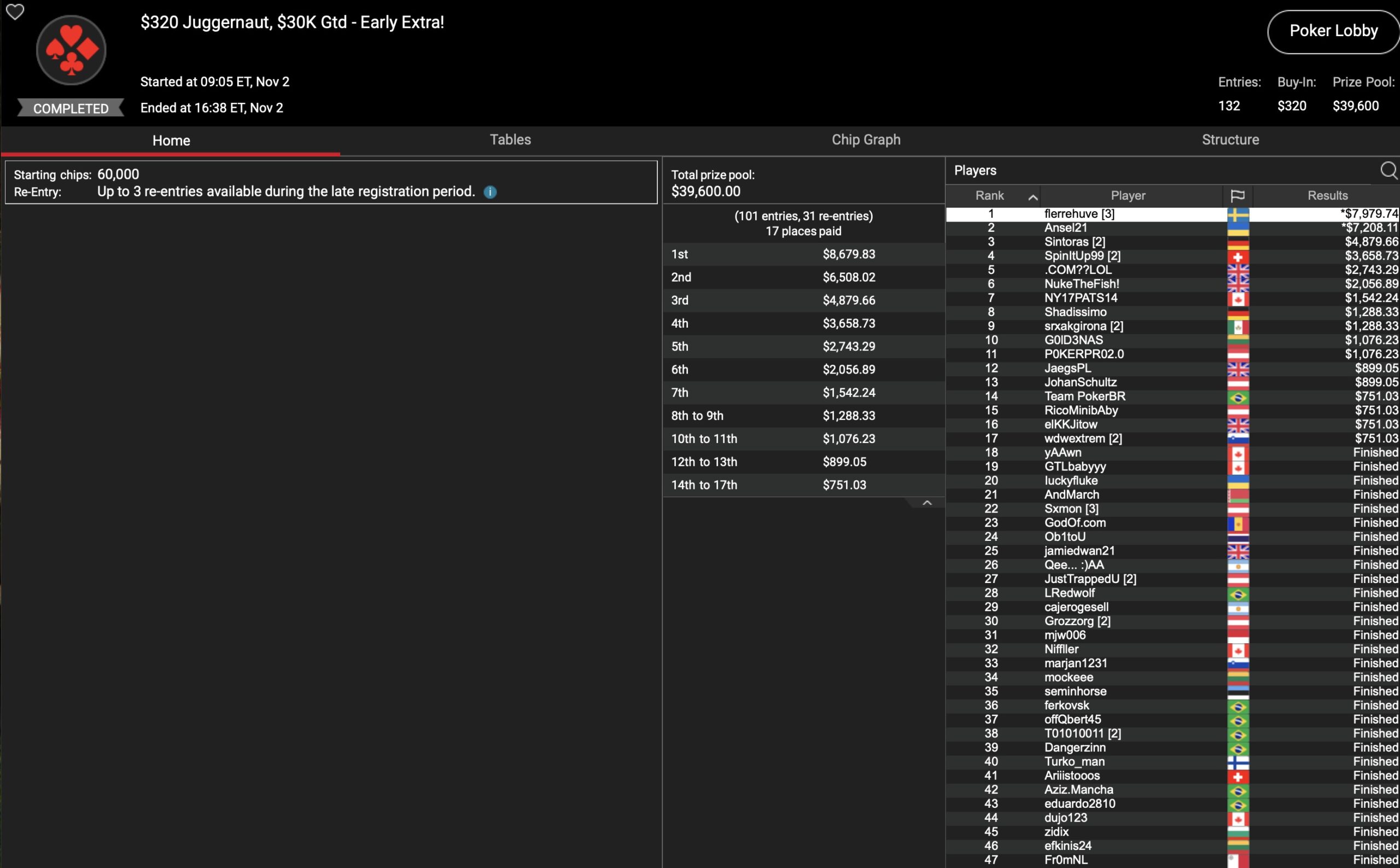 Im $320 Juggernaut sprangen gleich zwei deutschsprachige Spieler an den 7-Handed Final Table: „SpinItUp99“ (SUI) wurde unter den 132 (101+31) Entrys Vierter und kassierte $3.658. Dritter wurde Online-Phänomen „Sintoras“ (GER), der $4.879 cashen konnte. Nach seinem Ausscheiden einigten sich die beiden HU-Kontrahenten auf einen Deal, der „flerrehuve“ aus Schweden den Sieg und $7.979 brachte.