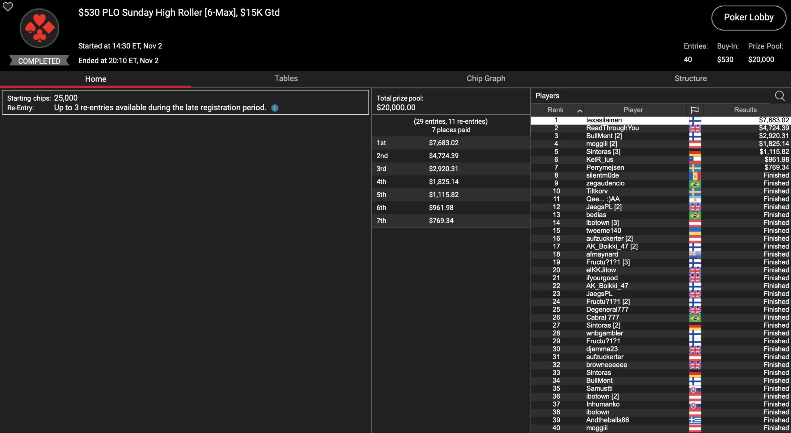 Gleich 2 deutschsprachige MTT-Spezialisten landeten im $530 PLO Sunday High Roller am finalen Tisch: Dort wurde „moggiii“ (AUT) unter den 40 (29+11). Entrys für $1.825 4., während der andere FT-Platzierung – wie könnte es anders sein – an „Sintoras“ (GER) ging, der für $1.115 auf Rang 5 landete. Der Sieg und $7.683 gingen an „texcasilainen“ (FIN).