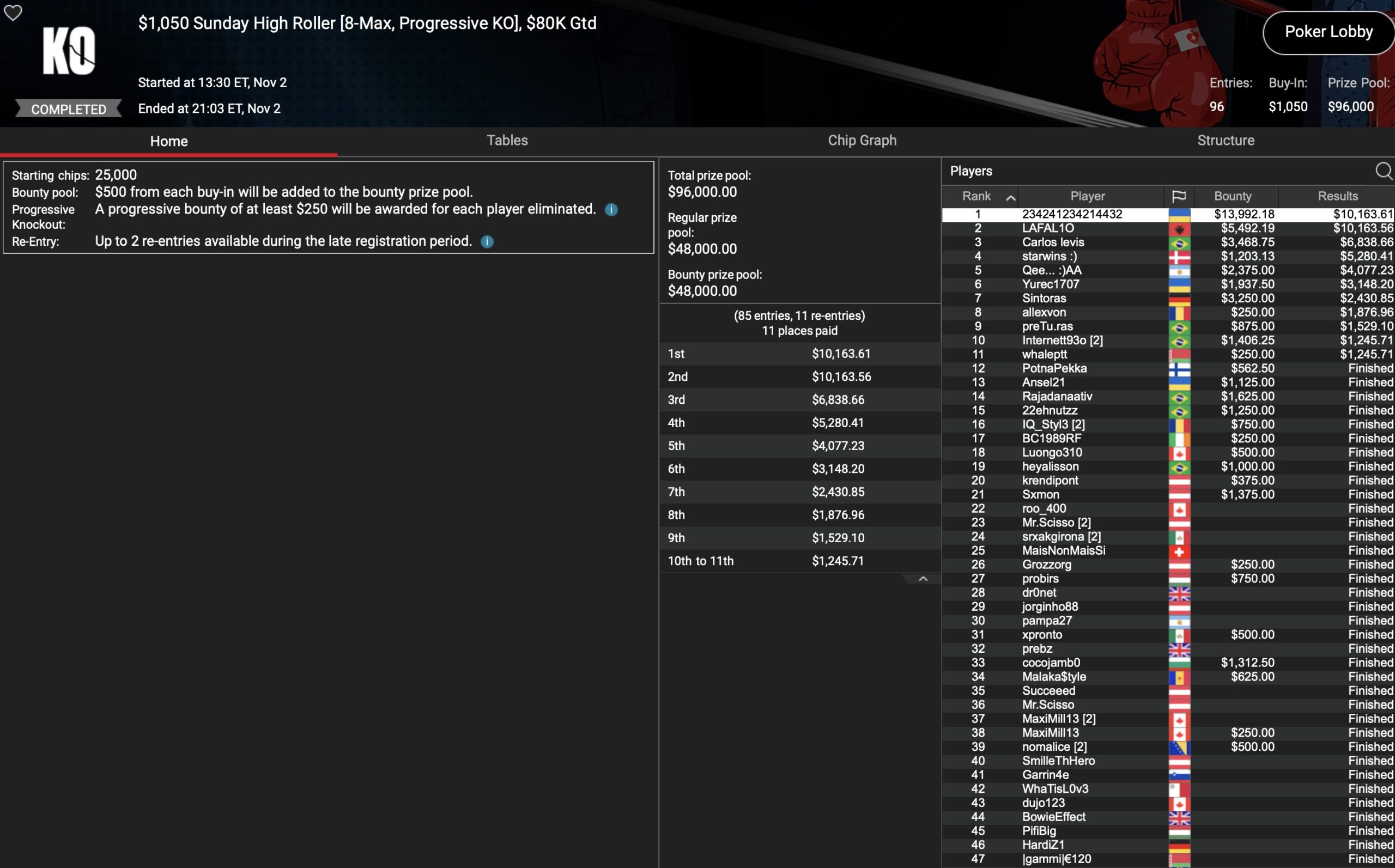 Im $1.050 Sunday High Roller war es einmal mehr „Sintoras“ (GER), der am Final Table Platz nehmen konnte. Rang 7 unter 96 (85+11) Entrys war am in dem PKO-MTT am Ende $2.430+$3.250 wert. Der Sieg samt dem Payout von $10.163+$13.992 ging an den Spieler mit dem eingängigen Namen „234241234214432“ (UKR).