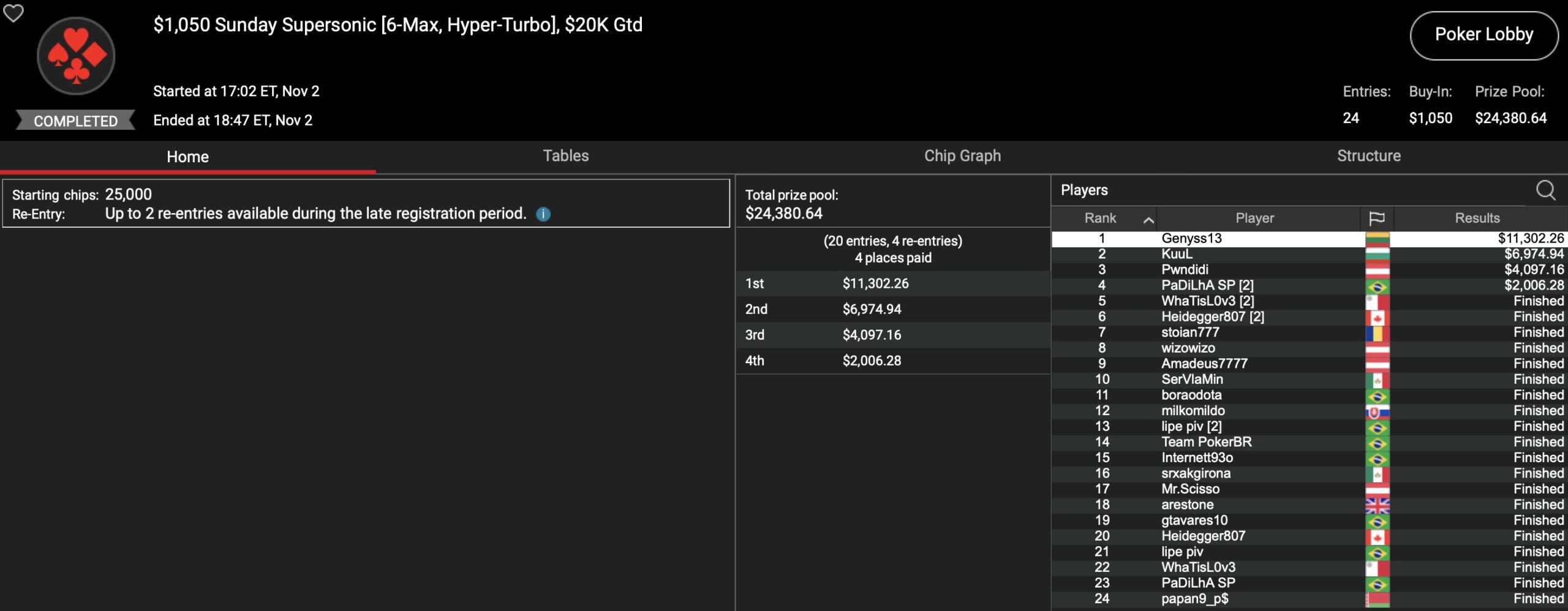 Auch im $1.050 Sunday Supersonic fand der Final Table nicht ohne Beteiligung eines Spielers aus dem D-A-CH-L statt: Der griechische Wahlösterreicher Alex „Pwndidi“ Theologis wurde unter 24 (20+4) Entrys für $4.097 Dritter. Den Sieg samt $11.302 holte sich „Genyss133“ (LIT).