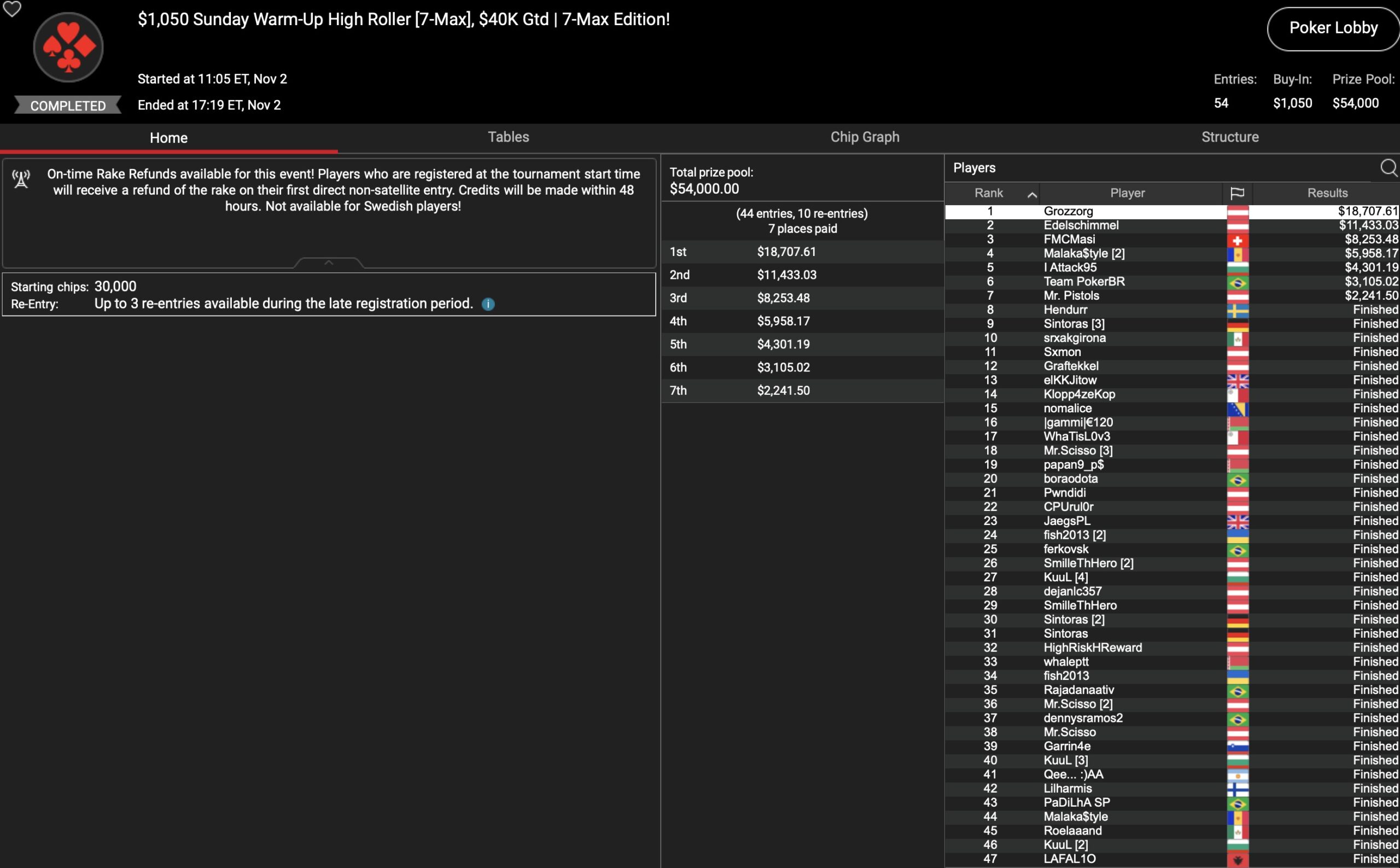 Den größten Erfolg des Tages landete Leonard „Grozzorg“ Maue (AUT) mit seinem Sieg im $1.050 Sunday Warm-Up. Unter den 54 (44+10) Entrys war der Erfolg für den EPT-Preisträger $8.707 wert. Dabei konnte die D-A-CH Community sogar einen Dreifachsieg verbuchen. Denn „Edelschimmel“ (AUT) und „FMCMasi“ (SUI) belegten für $11.433 und $8.253 die weiteren Podiumsplätze. Mit „Mr. Pistols“ (AUT) landete ein weitere deutschsprachiger Spieler als 7. für $2.241 am FT.