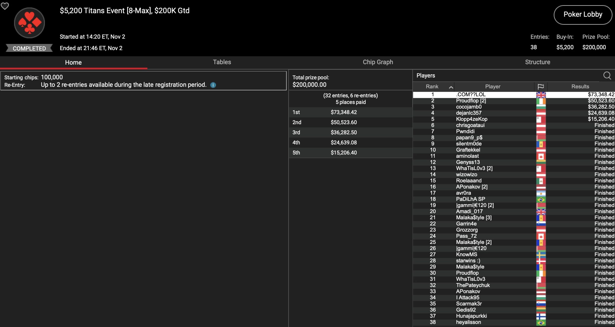 In den High Roller Events des Sonntags konnten die D-A-CH-L Spieler mit den großen Bankrolls ein paar Finaltische einfahren: Im $5.200 Titans Event war es unter 38 (32+6) Entrys „dejanlc357“ (AUT) der die Ehre der deutschsprachigen Spieler verteidigen und Rang 4 für $24.649 einfahren konnte, während „.COM??LOL“ (GBR) das Event mit $73.348 Payout für sich entscheiden konnte.