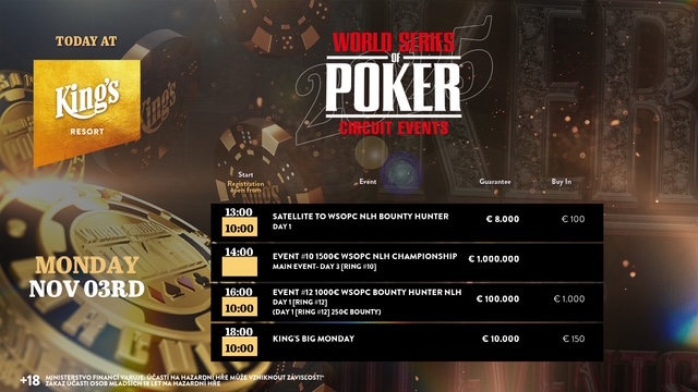 Bei der 1 Million Crown Series im King’s Casino Prag wurde um mindestens garantierte 1.000.000 CZK bzw. 40.000 EUR gespielt. Das 2-Day Event hatte ein Buy-In von €80 und besaß 7 Starttage plus 1 Pineapple Flip and Go. Gespielt wurde an den Starttagen jeweils bis nur noch 10% der Spieler*innen eines Flights im Turnier verblieben. Sie hatten dann nicht nur ihre Chips im Finale (SO, 17:00 Uhr) sicher, sondern auch bereits den Mincash in Höhe von €160. Für den Chiplead eines jeden Flights gab es außerdem immer ein King of King’s Highroller Ticket (KoK) im Wert von jeweils €500.