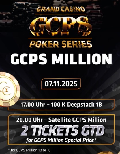 Das GCPS Million Festival wird heute ab 17:00 Uhr mit Tag 1B vom 100k Deepstack fortgesetzt. Für 180+20 CHF Buy-In geht es mit 40.000 Starting Chips in die 30-minütigen Level des ersten von vier Starttagen in dem 2-Day-Event. Die Late Registration ist 10 Level geöffnet. Die namensgebende 100.000 CHF Garantie enthält auch 10 GCPS Million Special Price Tickets zu je 1.000 CHF.