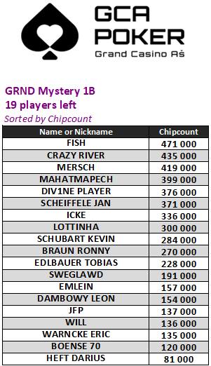 19 Spieler schafften den Sprung in das Finale am Sonntag um 14:00 Uhr, allen voran ein Spieler mit dem Spitznamen ‚FISH‚ mit 471.000 Chips. Chipleader ist weiterhin ‚GREIZA‘ aus Tag 1A mit 587.000 Chips.