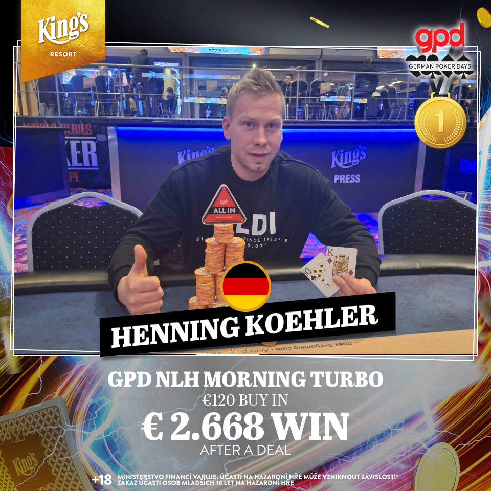 136 Spieler nahmen am Morgen an den Tischen in der Poker-Arena Platz, um das €120 GPD NLH Morning Turbo auszufechten. Sie zahlten außerdem für 31 Re-Entries und somit kam es zu einem €16.833 Preispool.