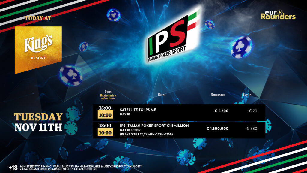 Im Italian Poker Sport Main Event werden insgesamt 11 Qualifikationsflights ausgetragen (9 Starttage in Rozvadov, 1 Starttage in Prag, sowie ein 8-handed Flip and Go). Das Startgeld beträgt jeweils €380 (15% Steuer+Fee). Dafür erhält man 50.000 Starting Chips und 40 Minuten Spielzeit pro Level (30 Minuten in den Speed und 12 in den Turbo Flights). 2- Re-Entrys sind während der 10 Level Late Registration möglich. Aus jedem Starttag qualifizieren sich die besten 12,5% für Tag 2 (SO, 17:00 Uhr) des 3-Day Events. Aus dem mit mindestens €1.500.000 garantierten Preispool haben alle Spieler*innen, die es in Tag 2 schaffen bereits €750 Mincash sicher. Auf den Chipleader eines jeden Starttages wartet außerdem ein Chipleader-Bonus in Form von King’s Main Event Tickets im Wert von €1.150. Im Preispool enthalten sind außerdem 10 Packages à €3.000 für die King’s Million European Poker Championship (KM EPC). – Satellites für das IPS M.E. finden im Pokerroom King’s für €70 statt.