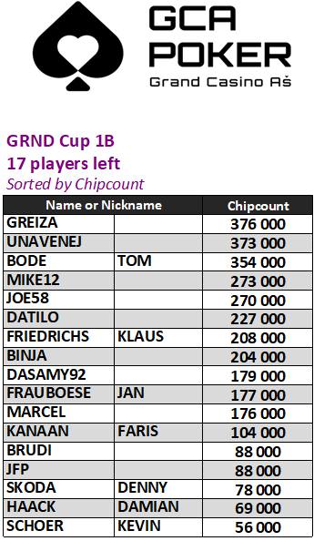 Im zweiten von drei Starttagen gingen im GRND Cup 1b 86 Spieler*innen im 17:00 Uhr ins Rennen um das mindestens garantierte €30.000 Preisgeld. 24-mal musste für das €85+€15 Startgeld ein Re-Entry herhalten. Die 110 Total Entrys spielten 17 Überlebende runter, die am Ende bei Blinds 5.000/10.000-10.000 ankamen.