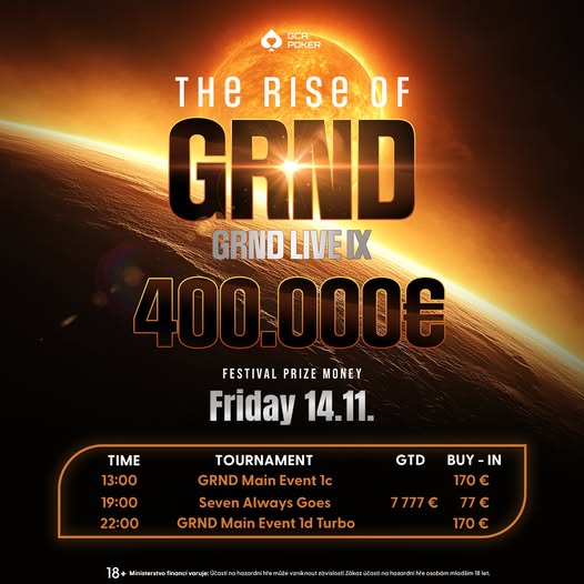 Heute stehen um 13 Uhr und um 22 Uhr gleich zwei Starttage des GRND LIVE IX Main Event an, außerdem wird um 17 Uhr das €77 Seven always goes mit einer Garantie von €7.777 angeboten.