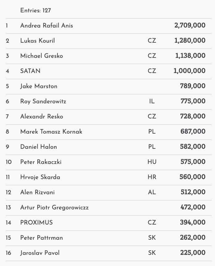 Von den 16 Spielern, die aus Flight 1e den Sprung in Tag 2 schafften, war Andrea Rafail Anis mit 2.709.000 Chips der mit Abstand erfolgreichste. Er übernimmt mit dem großen Stack auch den Overall-Chiplead.