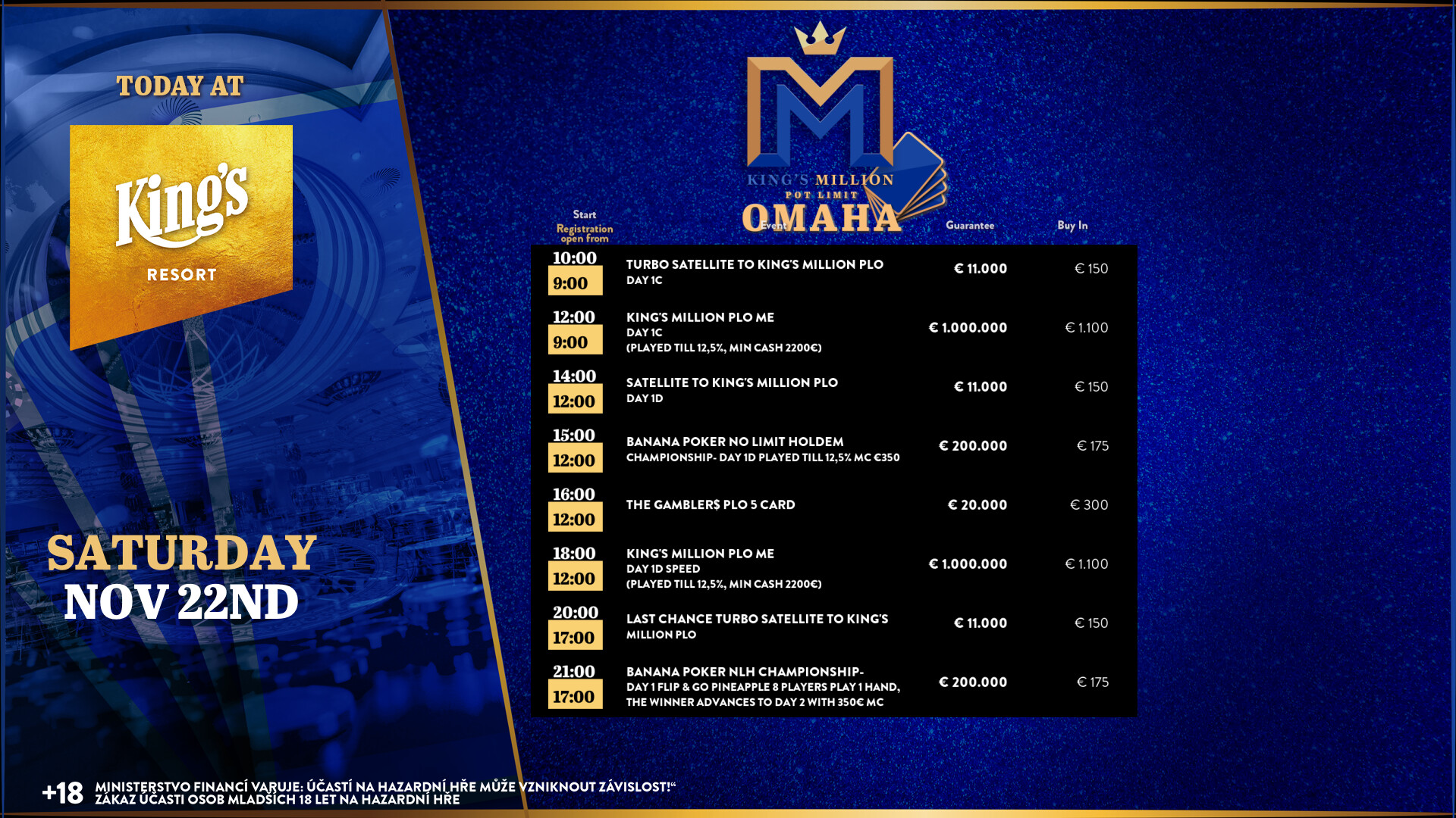 Das €1.100 Main Event des King’s Million PLO im King’s Resort Rozvadov ist gestartet, am Freitag wurden die ersten zwei Startflights gespielt. €1.000.000 werden in dem Turnier garantiert!