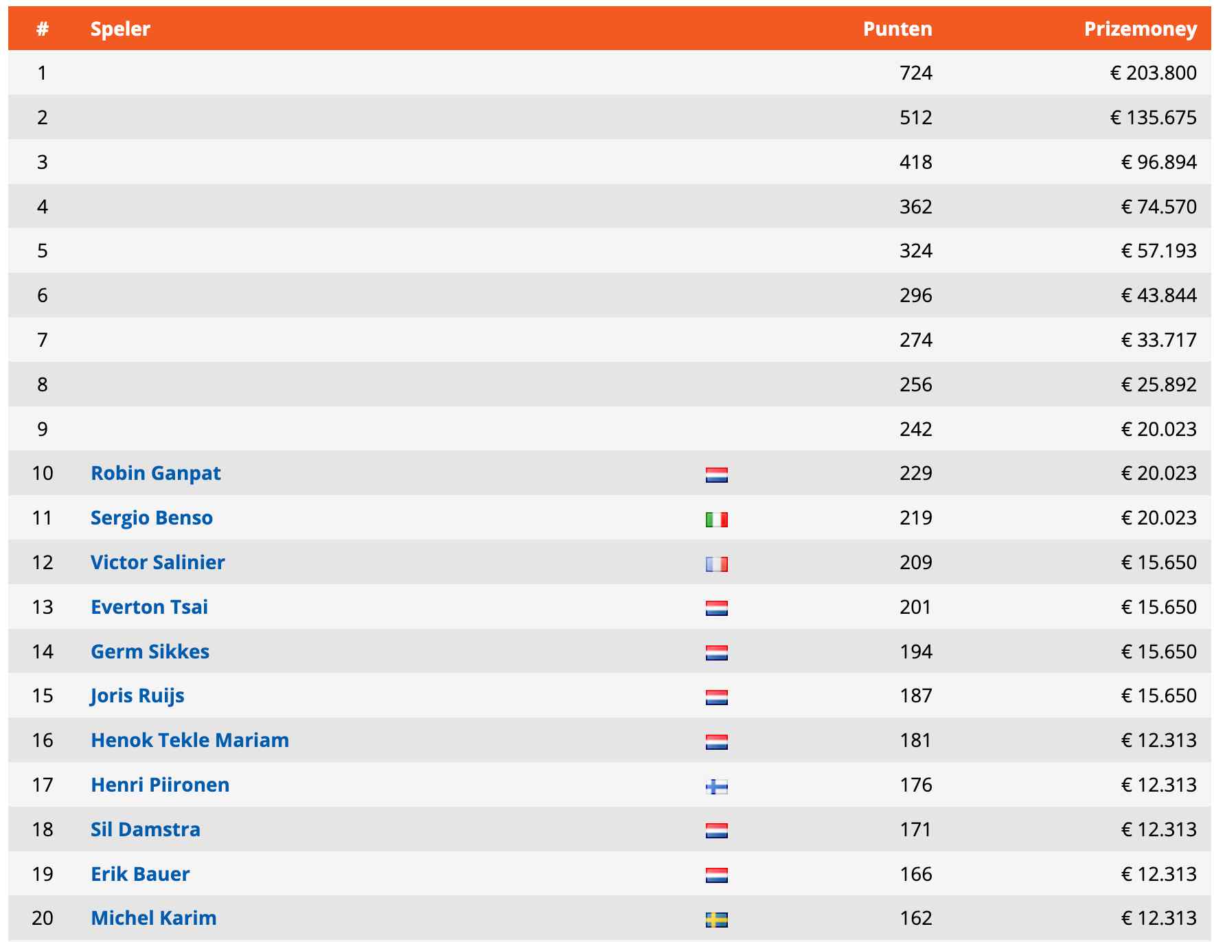 Nun spielen heute eine Hälfte Niederländer sowie ein Brite, ein Däne und zwei Finnen um den €203.800 schweren Titel. Alle Spieler haben €20.023 sicher.