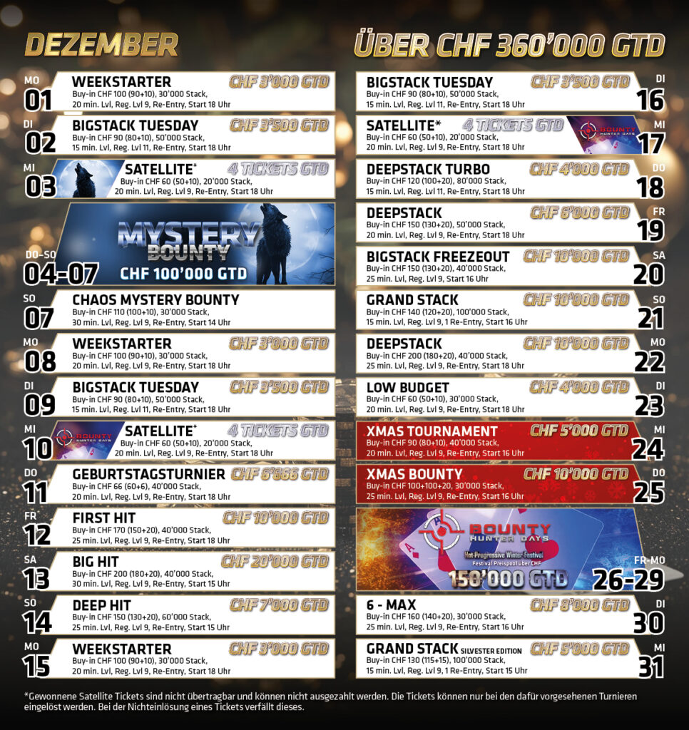 Neben Turnieren werden täglich von 17:00 bis 04:00 Uhr auch Cash Games in den Varianten NLH, PLO, STUD, OFC für alle Limits angeboten, startend ab CHF 1/3 (NLH) und CHF 1/1 (PLO).