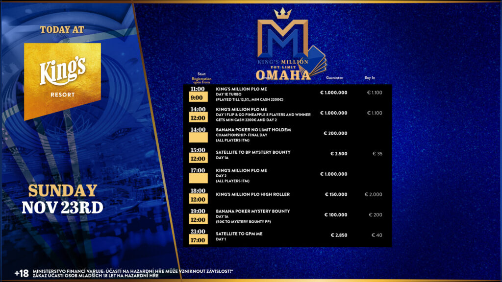 Bei der King’s Million PLO wurden am Samstag die Starttage 1C und 1D im King’s Resort Rozvadov ausgetragen. Damit sind vier der sechs Qualifikationsmöglichkeiten für den heutigen Tag 2 gespielt. Vor dem abschließenden 1E-Flight und dem Flip and Go sind jedoch noch nicht einmal 55% der €1.000.000 Garantie im Preispool gelandet. Wer womöglich richtig dicken Added Value mitnehmen möchte, sollte sich schleunigst auf den Weg nach Rozvadov machen.