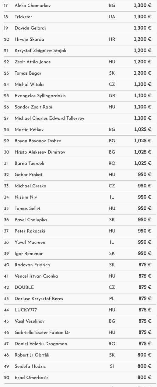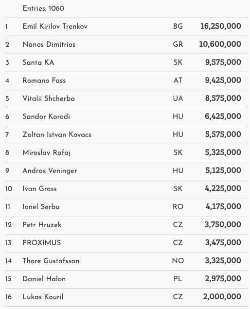 Gestern wurden der letzte Flight sowie Tag 2 des Turniers gespielt. Am Ende der Anmeldefrist kamen 1.060 Entries zustande, womit die €300.000 Garantie klar nicht erreicht wurde und das Card Casino SK ein beträchtliches Overlay an die Teilnehmer auszahlen musste – extra Value!