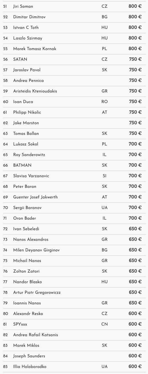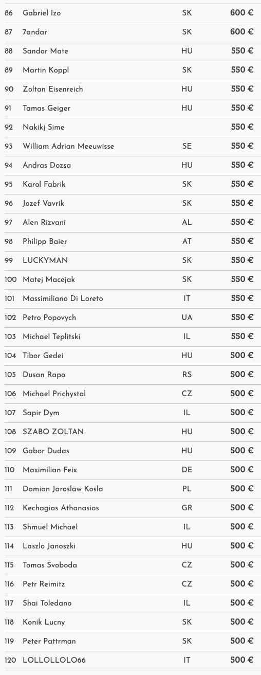 Payouts: (Platz 1 bis 9 zuzüglich €1.500 WSOPC Ticket)