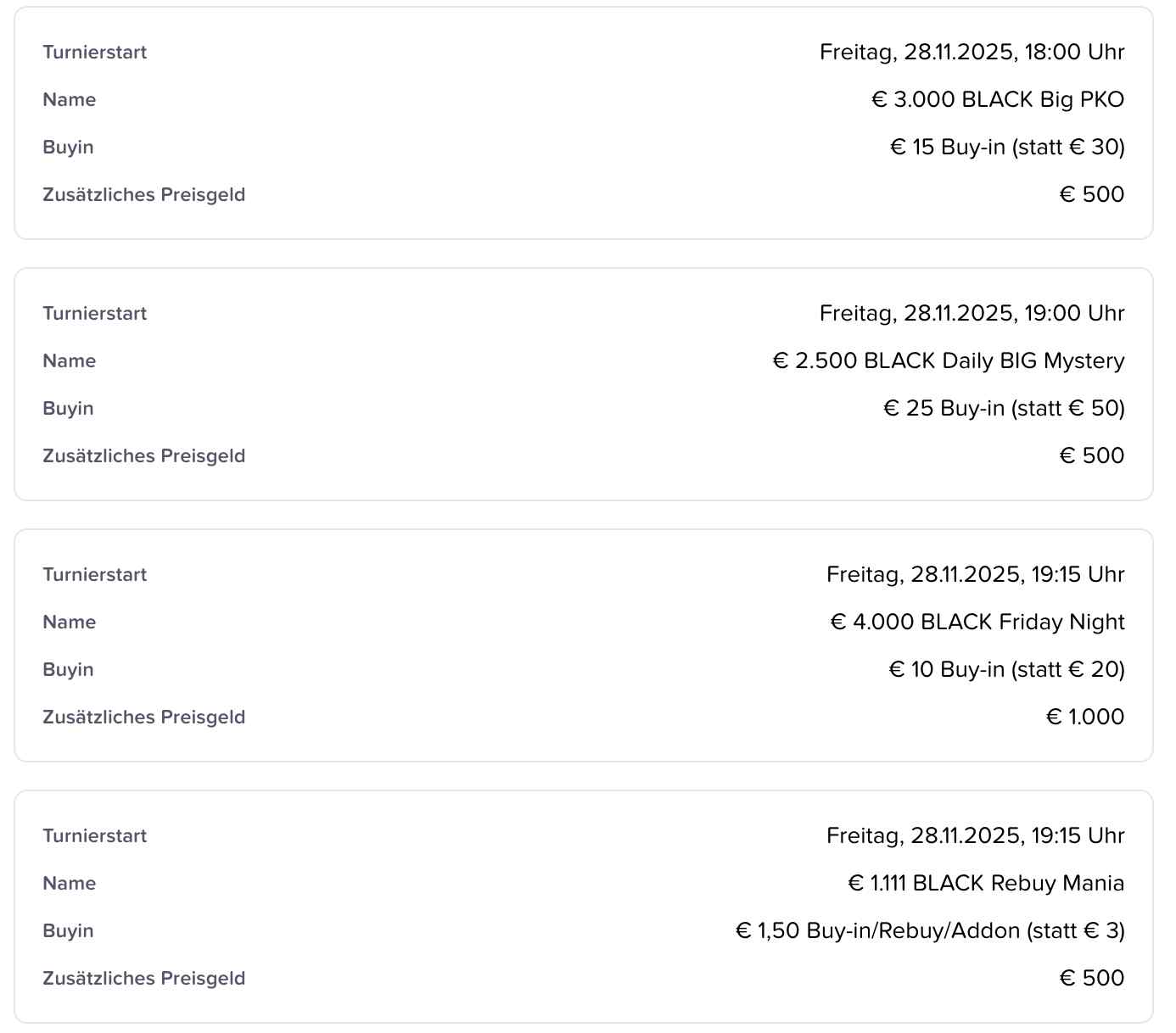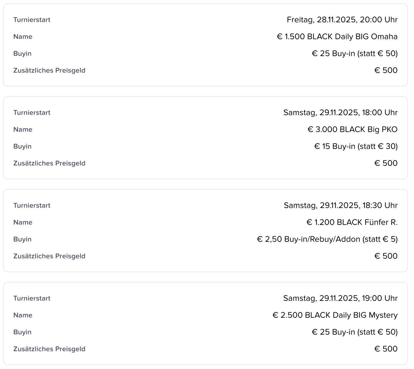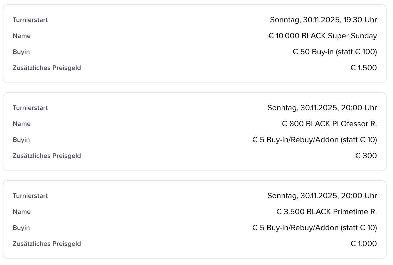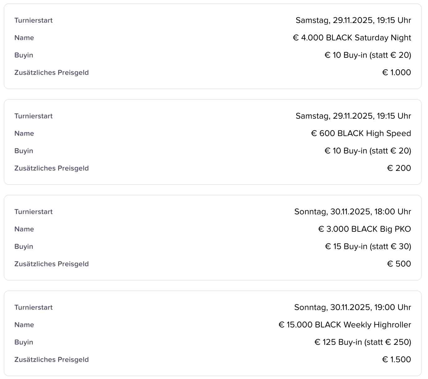 Aber auch kleine Bankrolls kommen beim Black Friday Weekend auf ihre Kosten mit Turnieren wie dem €5 Black Primetime R. mit €3.500 oder dem €10 Black Friday Night mit €4.000-Garantie.