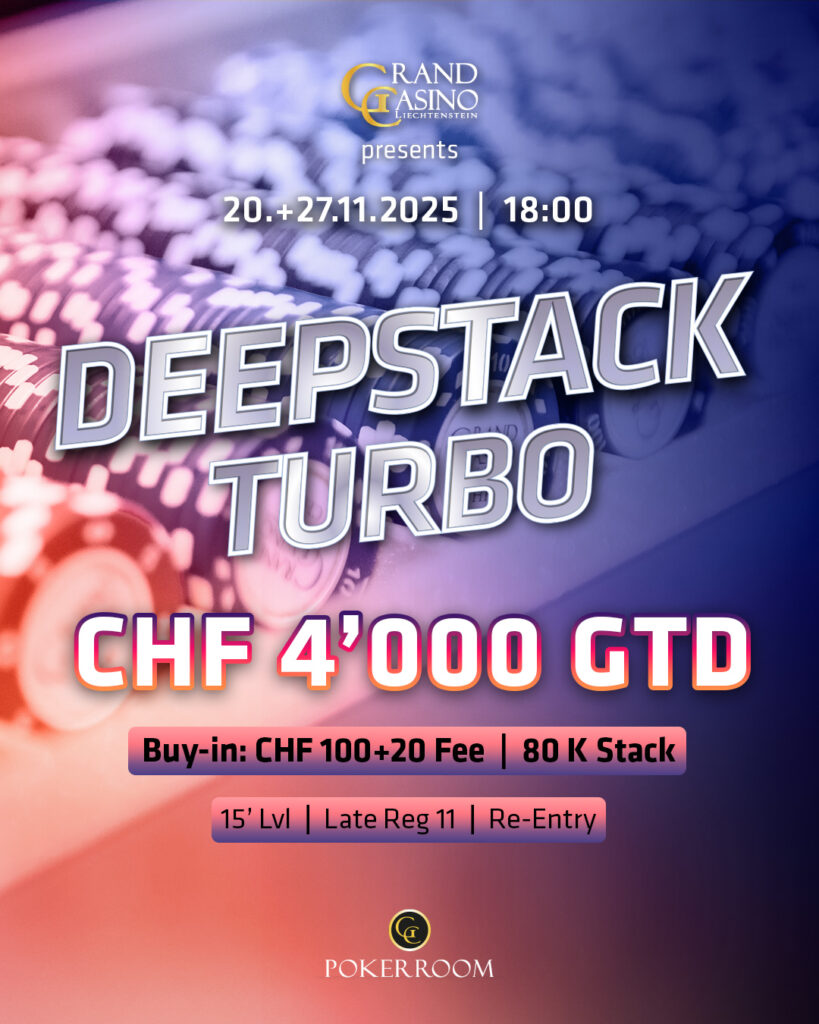 Heute geht es im Grand Casino Liechtenstein um 18:00 Uhr weiter mit dem CHF 100+20 Deepstack Turbo. Das Turnier wird gespielt mit einer CHF 4.000 Garantie, einem 80.000 Start Stack und 15 Minuten Blind Levels.