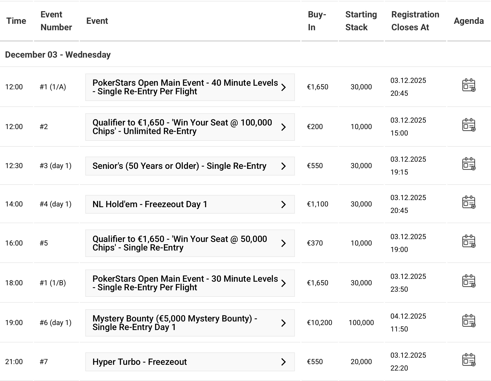 Das €1.650 PokerStars Open Main Event werden sechs Starttage vom 3. bis 5. Dezember angeboten. Der Tag 2 läuft am 6. Dezember, der tag 3 am 7. Dezember und das Finale wird am 8. Dezember ausgespielt.