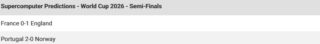 Im anderen Halbfinale trifft Portugal auf Norwegen, dessen beeindruckende Geschichte leider gegen die Mannschaft von Cristiano Ronaldo ein jähes Ende finden wird. Es wird erwartet, dass die Norweger mit 2:0 verlieren und damit zum ersten Mal überhaupt das Finale einer Weltmeisterschaft erreichen werden – für ihren legendären Kapitän das letzte Turnierspiel überhaupt.
