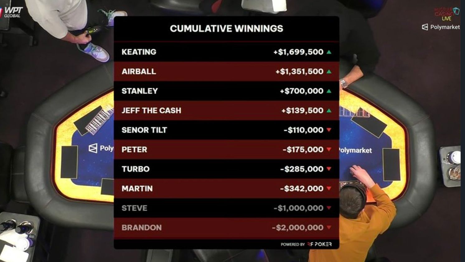 Keating blieb auch in der Folge der überlegene Spieler und beendete den Cashgame-Marathon mit einem Plus von über $1,6 Millionen. Auch Nik Airball machte ein siebenstelliges Plus, während Kabrhel seine Verluste mit $342.000 in Grenzen hielt.