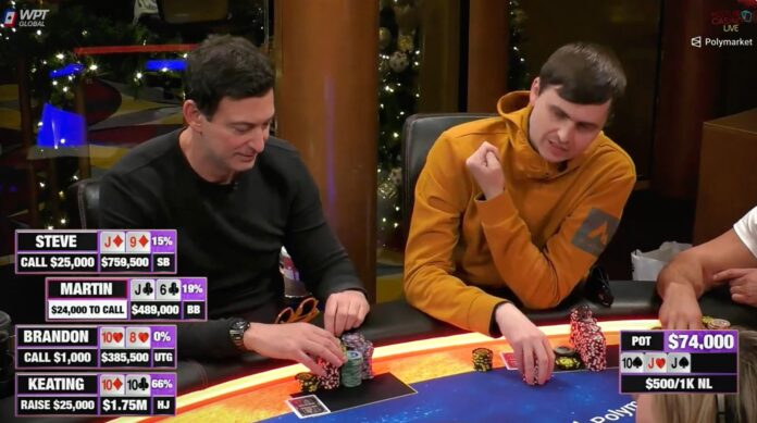 Keating war es auch, der schon recht früh eine extrem spektakuläre Hand gewinnen konnte. Auf einem Board mit JJT floppten Kabrhel und Steve Trips Jacks, während Keating mit TT das Full House getroffen hatte.