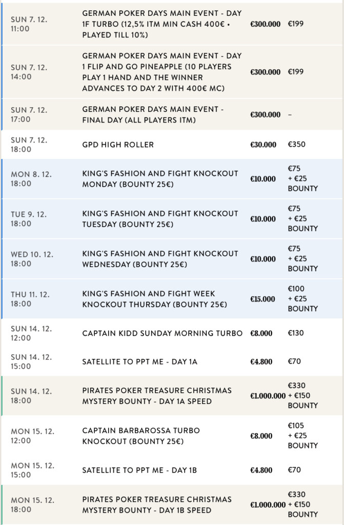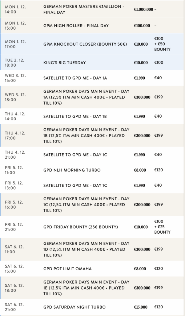 Für ein Startgeld von €199 wird bei diesem Turnier ein Preisgeld von €300.000 garantiert und insgesamt werden sechs Starttage angeboten.