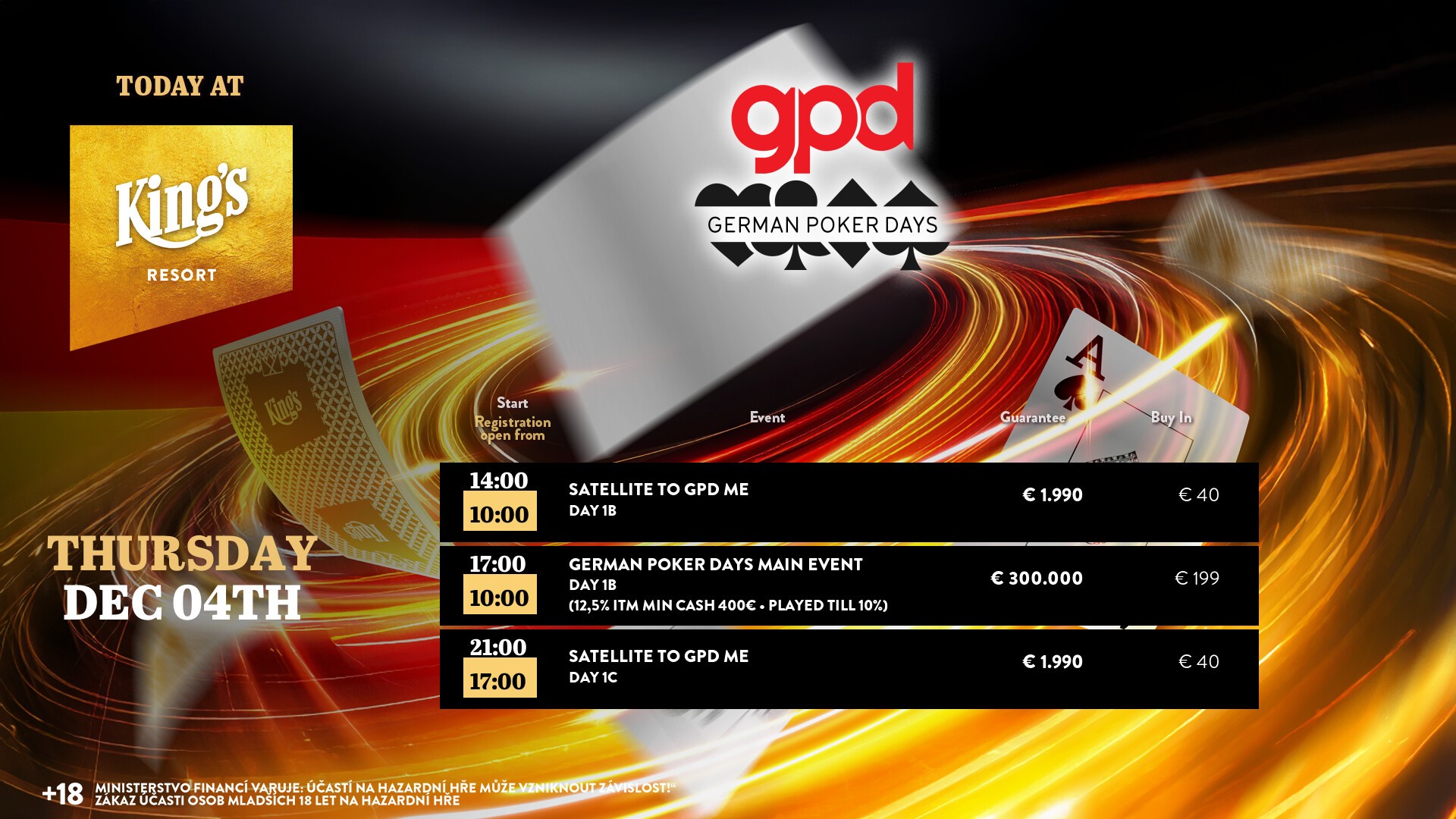 Heute geht es um 17 Uhr mit Tag 1B des GPD Main Events weiter, das Startgeld beträgt erneut €199. Davor und danach und werden €40 Satellites angeboten, mit denen man sich günstig qualifizieren kann.